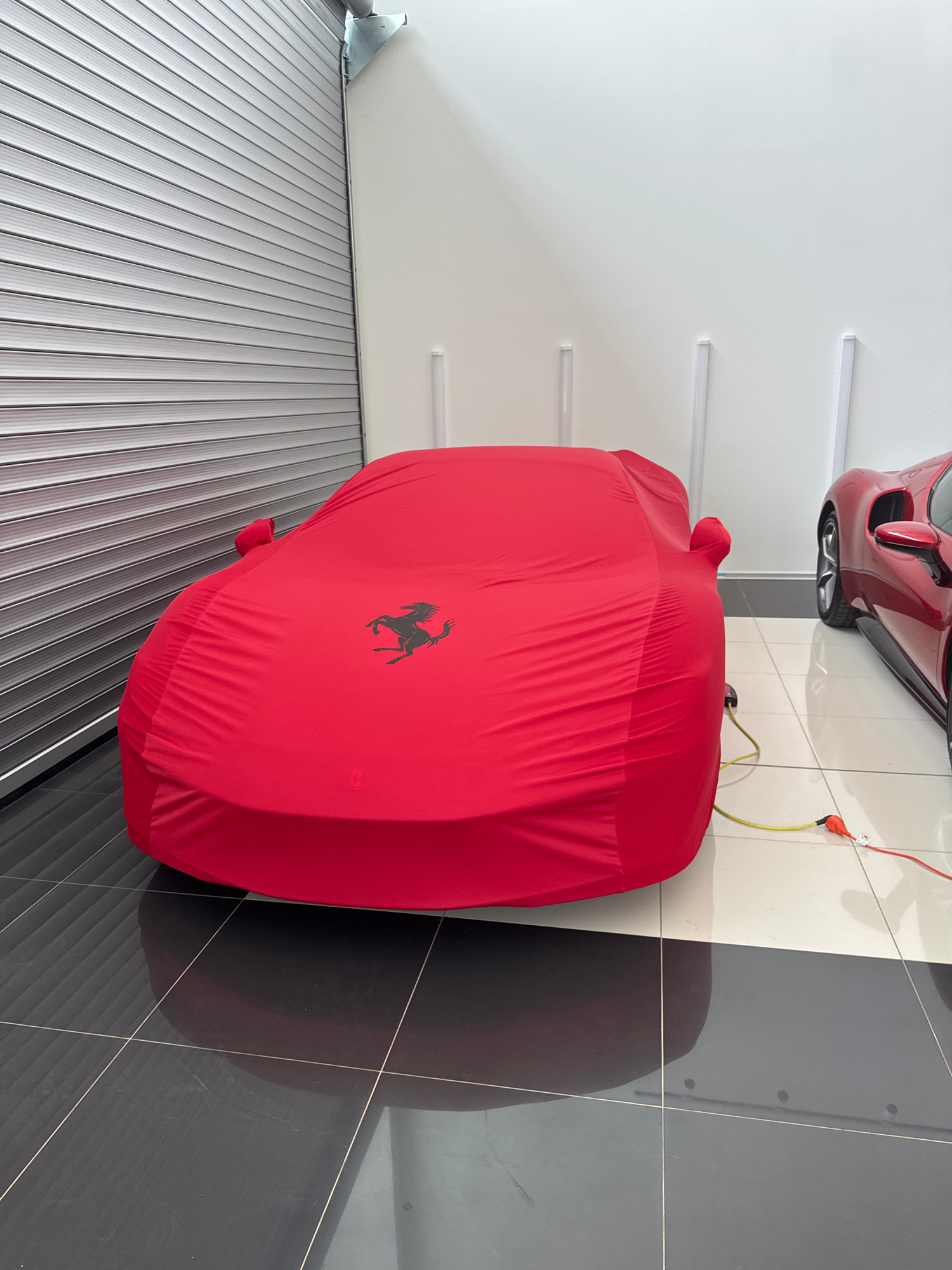 The vertically oriented image displays a meticulously kept indoor space, characteristic of a private garage or luxury car showroom in Sofia, Bulgaria. The primary subject is a car completely envelope…read more