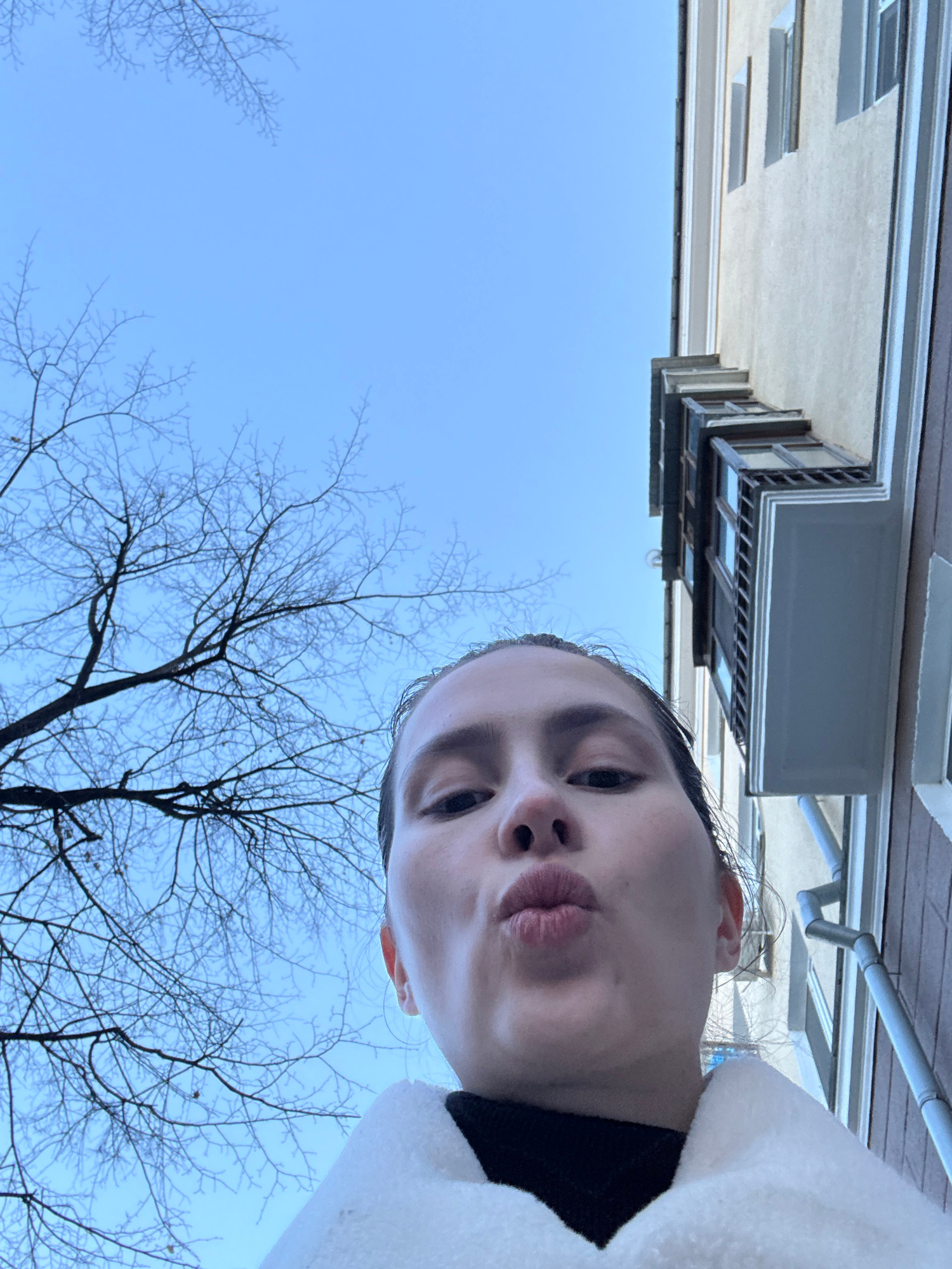 A selfie taken outdoors, likely in Yekaterinburg, Russia. A young woman with dark hair pulled back makes a pursed-lip face. The sky is light blue with bare branches of trees in the lower half of the f…read more