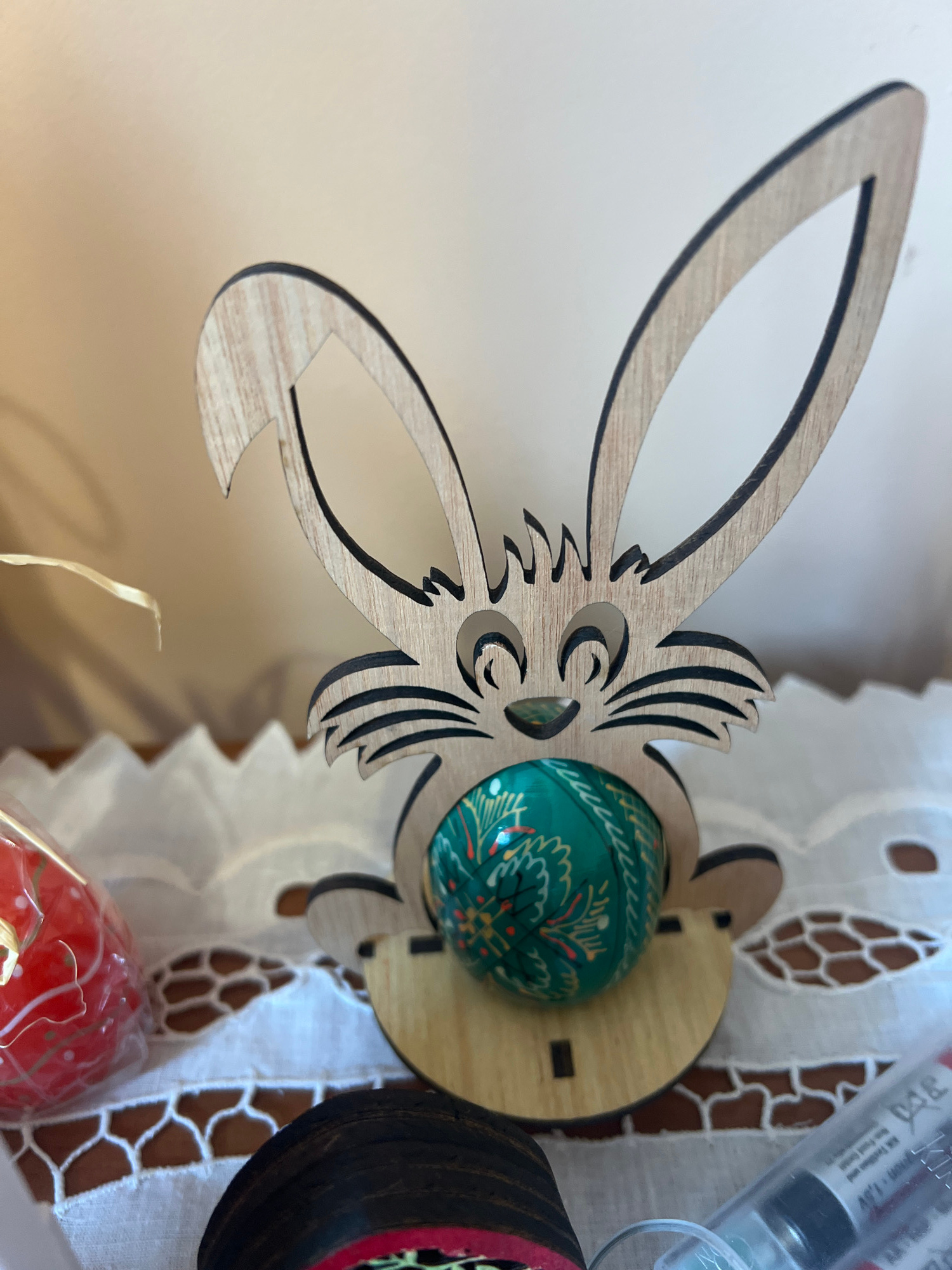 A close-up shows a wooden laser-cut rabbit decoration holding a green painted egg. The rabbit has stylized features and is made of light-colored wood with dark edges on the cutouts. The egg is turquoi…read more