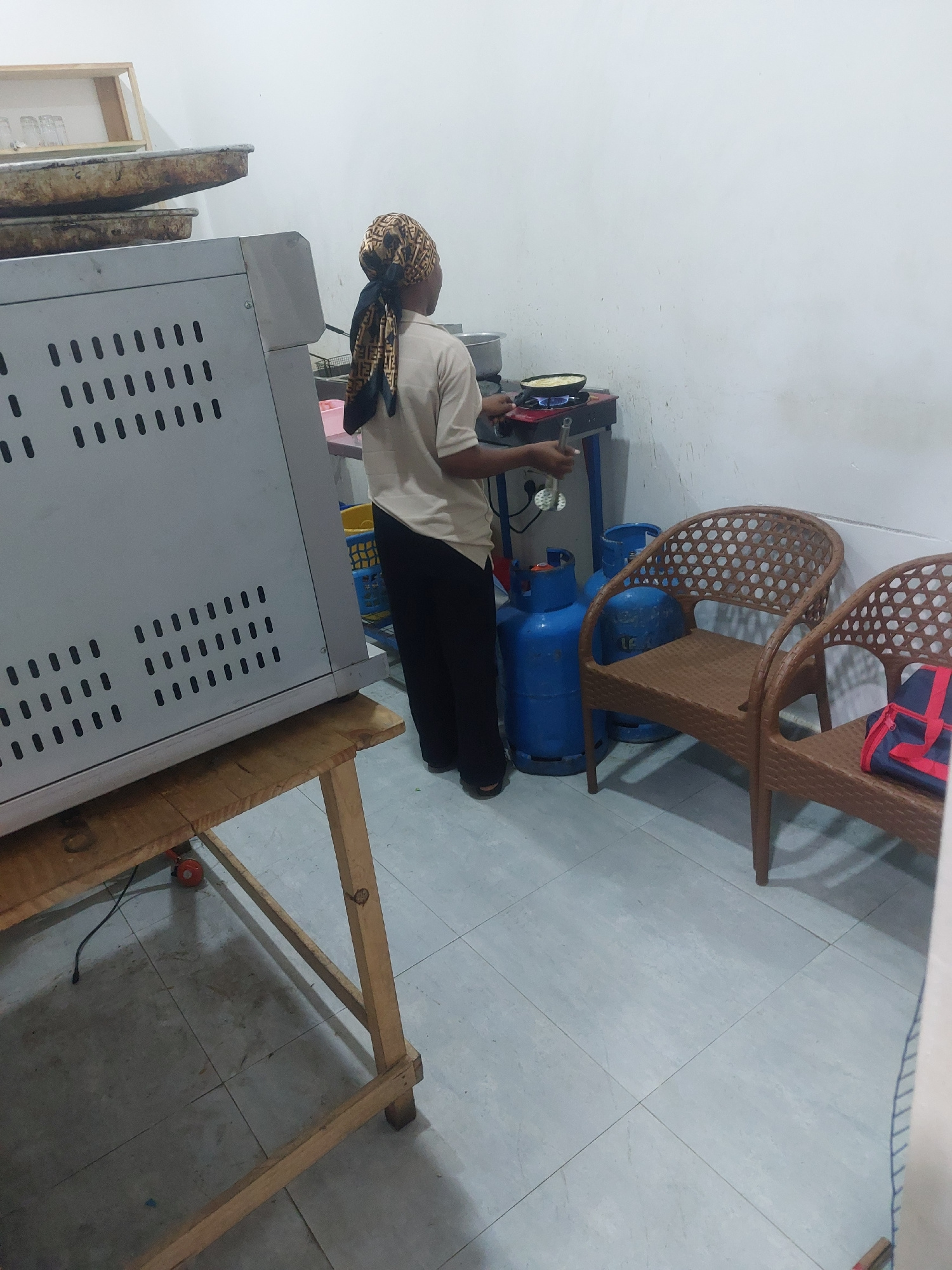 A person wearing a headscarf stands in what appears to be a kitchen or food preparation area. They are near a large, stainless steel oven. In the background, there are two blue propane tanks, a cookin…read more
