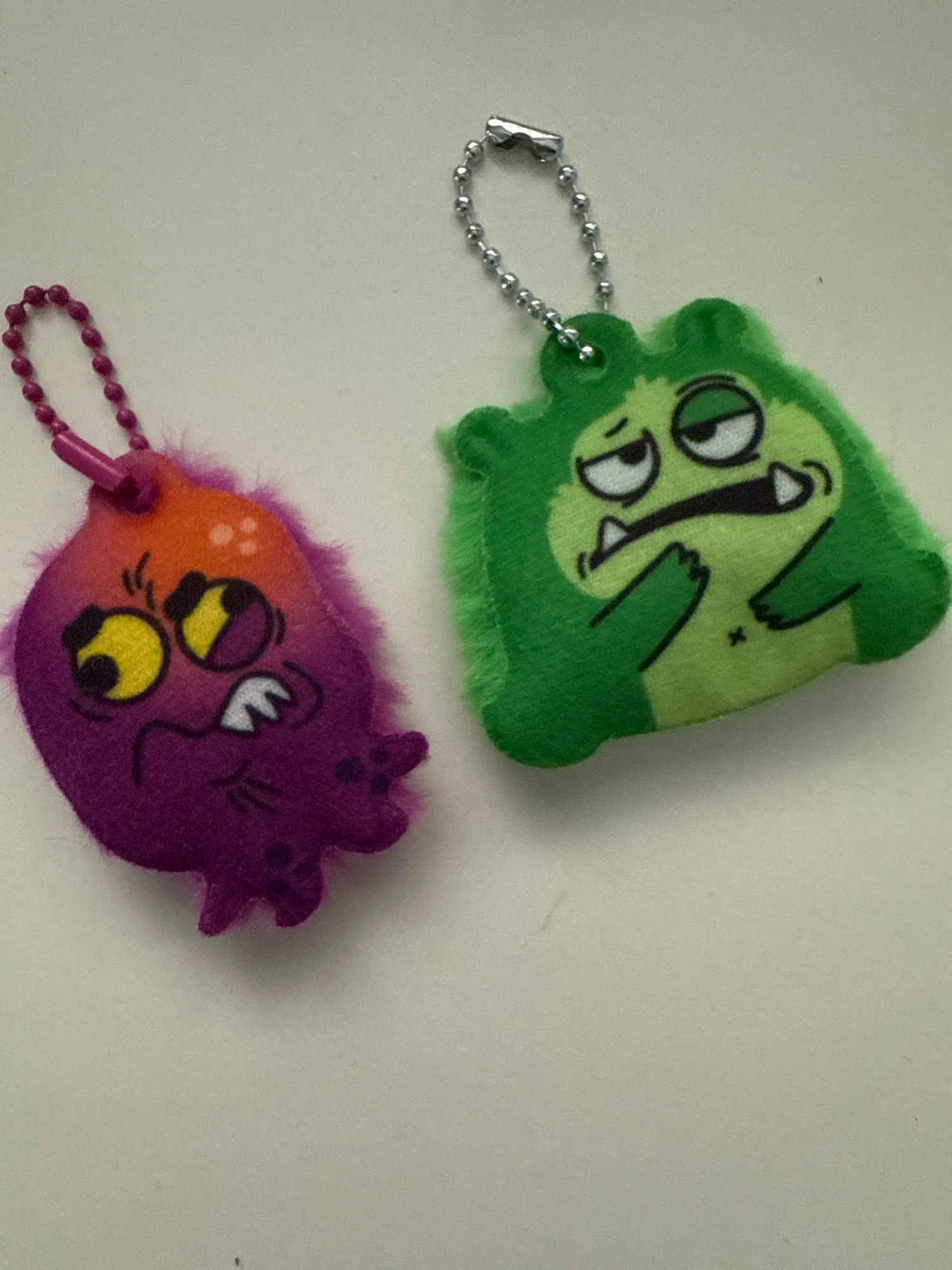 The image shows two cartoon-like plush keychains on a plain, likely white or light-colored surface. The top keychain is green and depicts a character with two eyes, an open mouth, and stylized limbs.…read more
