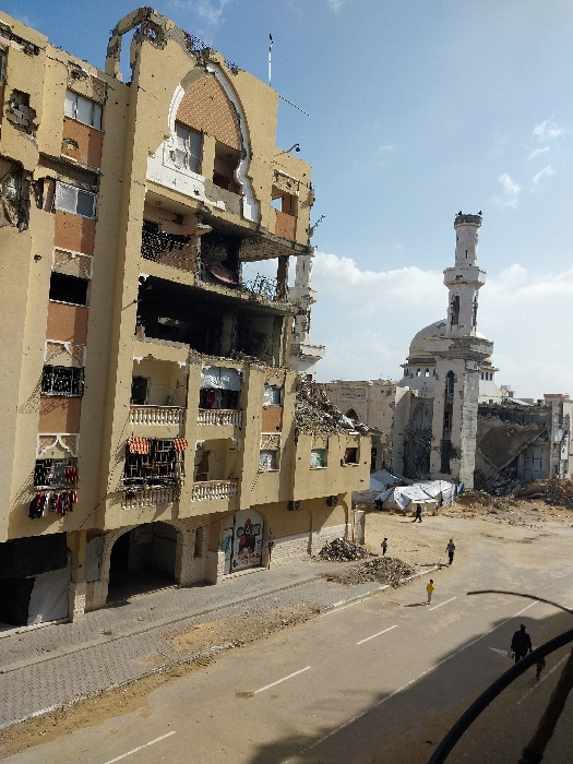 The image depicts a scene of extensive urban destruction in Khan Yunis, Palestinian Territory, under a partly cloudy sky. In the foreground and left mid-ground, a multi-story, light-tan residential bu…read more
