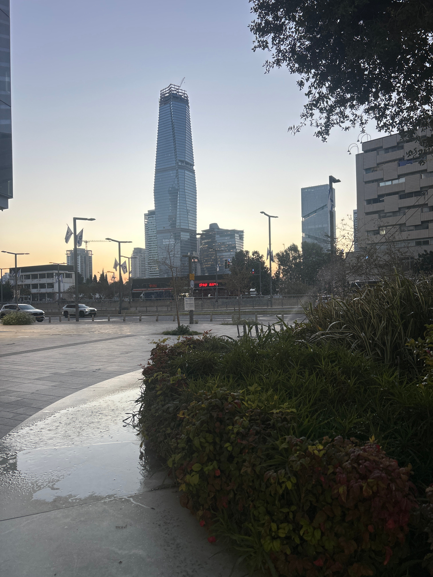 The image shows a street scene in Tel-Aviv, Israel. A tall skyscraper dominates the skyline, with other buildings visible in the background. Street lamps with flags line the street, and parked cars ar…read more