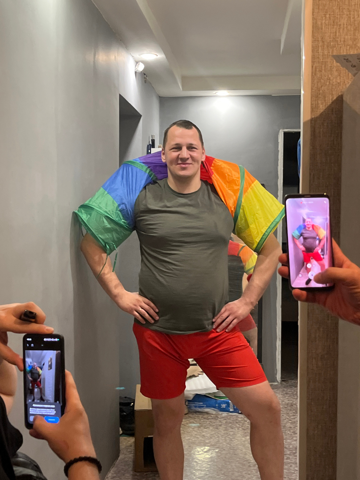 The image shows a man wearing a gray shirt and red shorts, partially inside a multicolored (rainbow-colored) fabric tunnel. He's standing with his hands on his hips and a slight smile on his face. The…read more