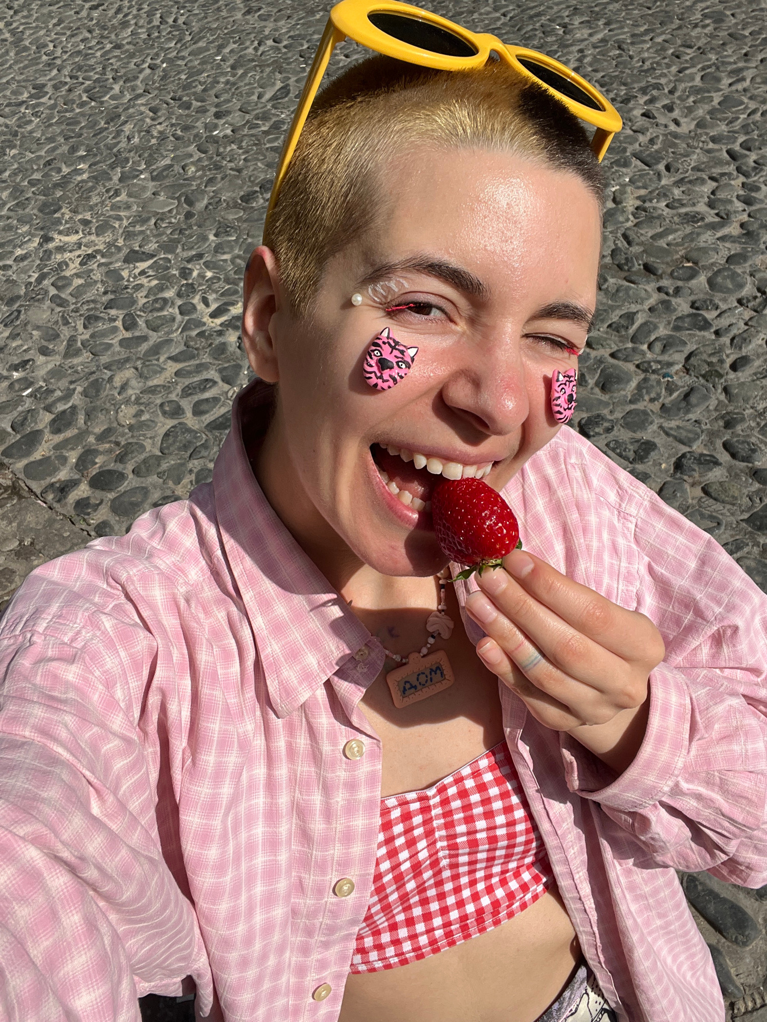 A person with short blonde hair and yellow sunglasses is lying on gray cobblestones, possibly in Belgrade, Serbia, although this cannot be confirmed from the image. They are wearing a pink and white p…read more