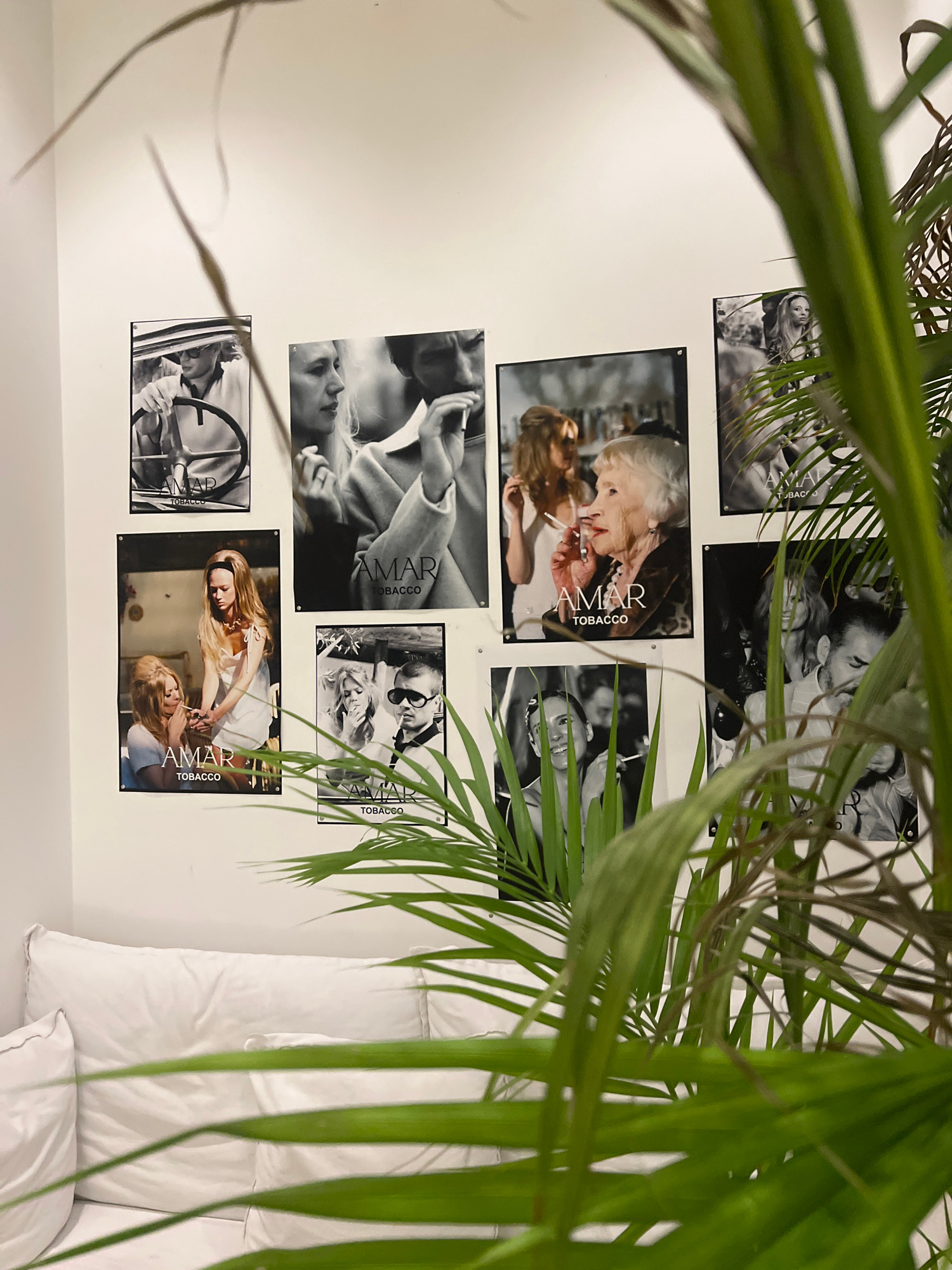 A wall adorned with a collection of black and white framed photographs, seemingly promotional images for "Amar Tobacco", is partially obscured by a potted palm plant with vibrant green fronds. The roo…read more