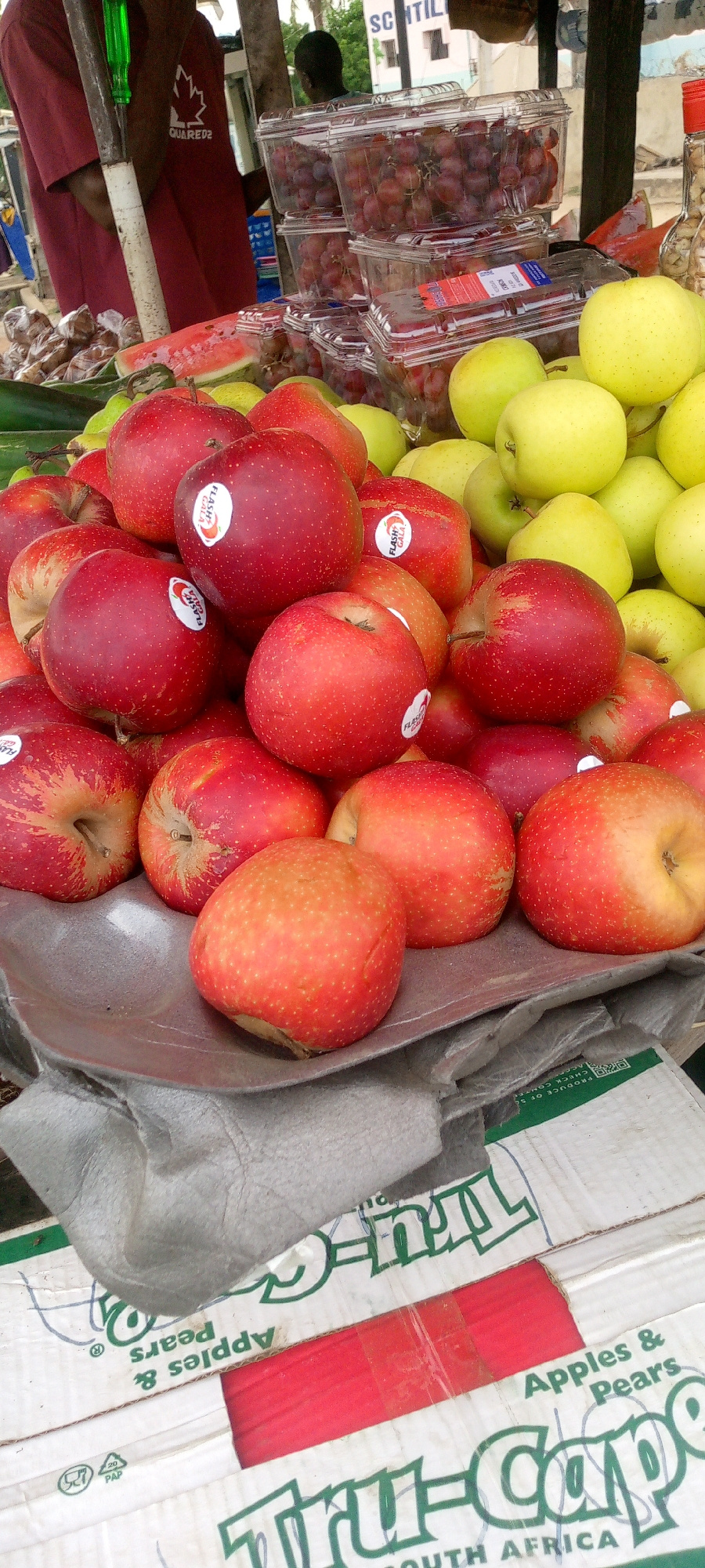 The image depicts a fruit stand, likely in Zango-ndaji, Nigeria, displaying a variety of fruits for sale. The focus is on a pile of red apples, some labeled "FLASH GALA", arranged on a silver-colored…read more