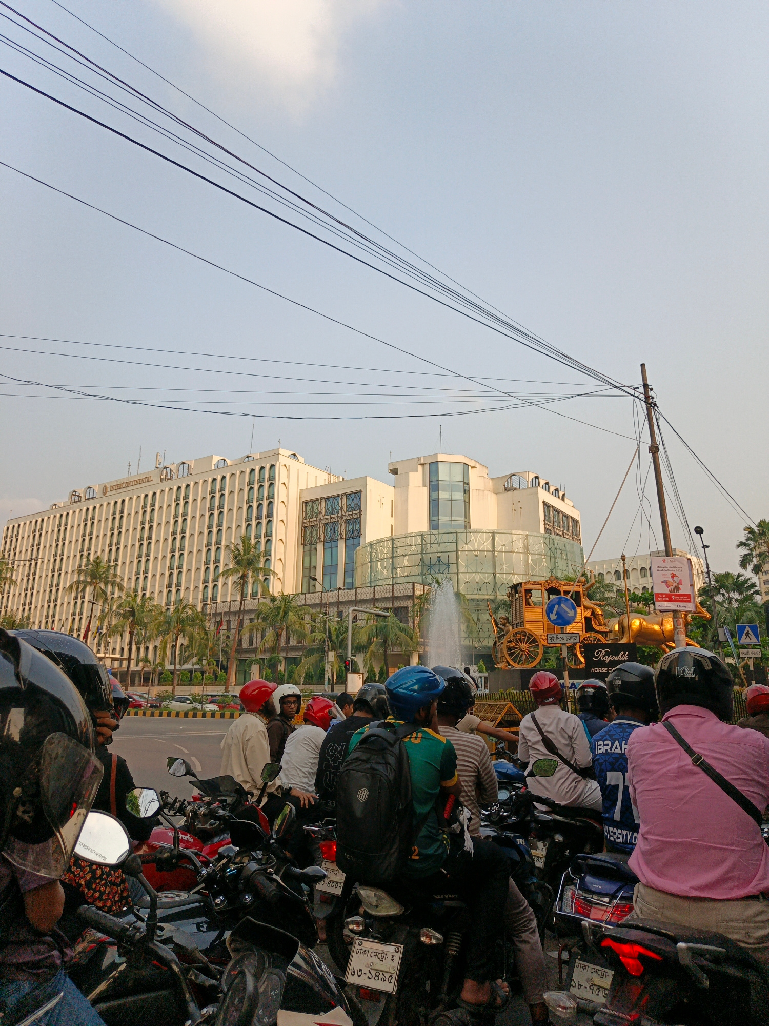 The image captures a bustling street scene in Dhaka, Bangladesh. A cluster of motorcycles and riders are gathered, likely at a traffic stop. Many are wearing helmets of various colors. In the backgro…read more