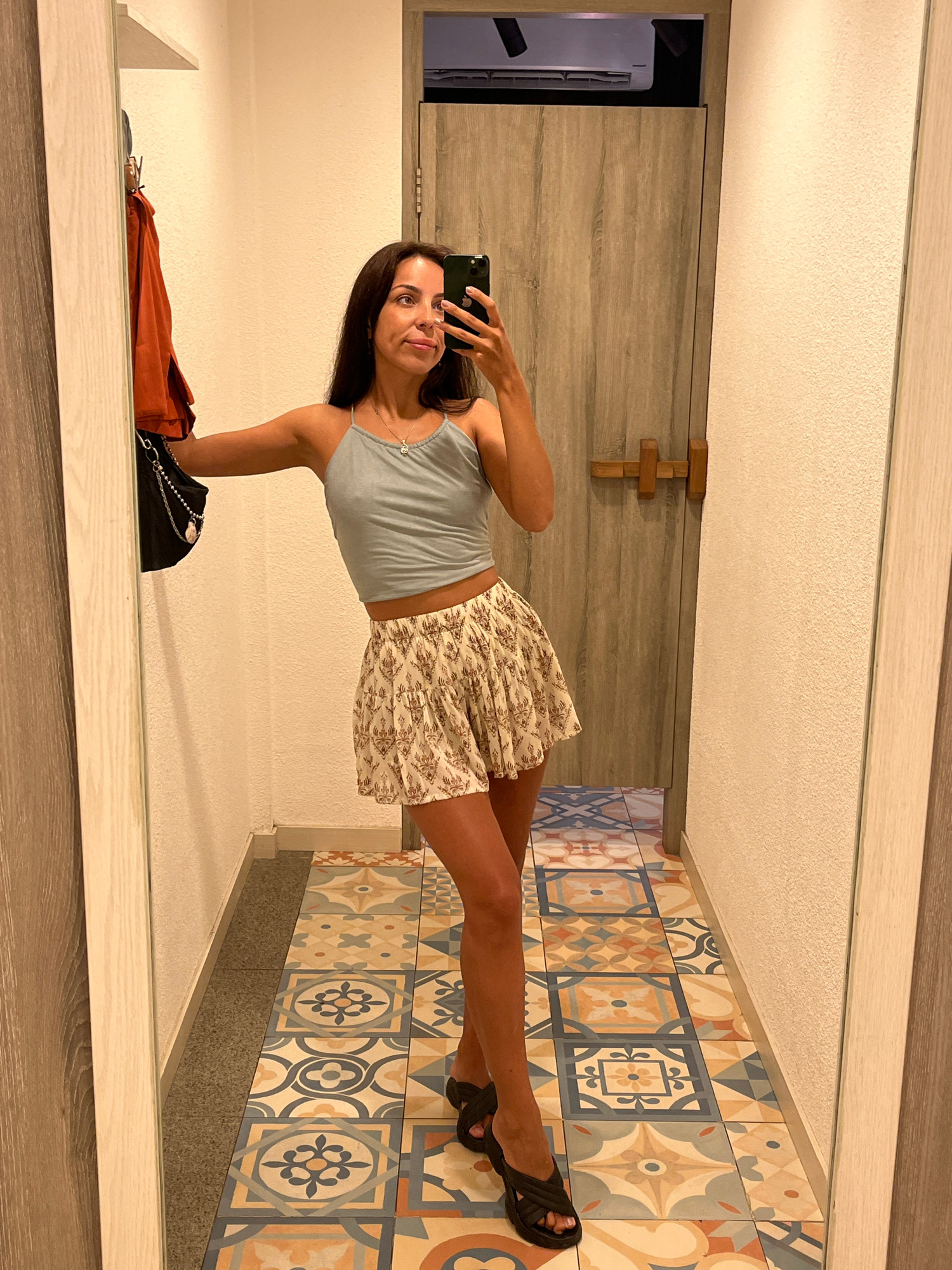 This image captures a mirror selfie of a young woman, presented with a 90-degree counter-clockwise rotation. The woman, who has long dark hair, is reflected standing upright, holding a dark smartphone…read more