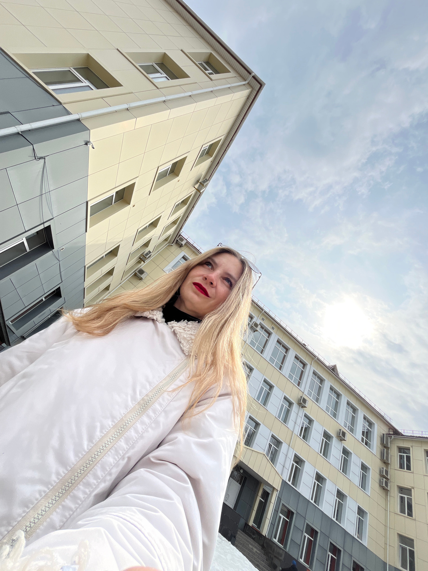 A low-angle shot features a blonde woman against a backdrop of two buildings and a cloudy sky. The woman, wearing a white jacket, is the central subject, and her head is slightly tilted upwards and to…read more