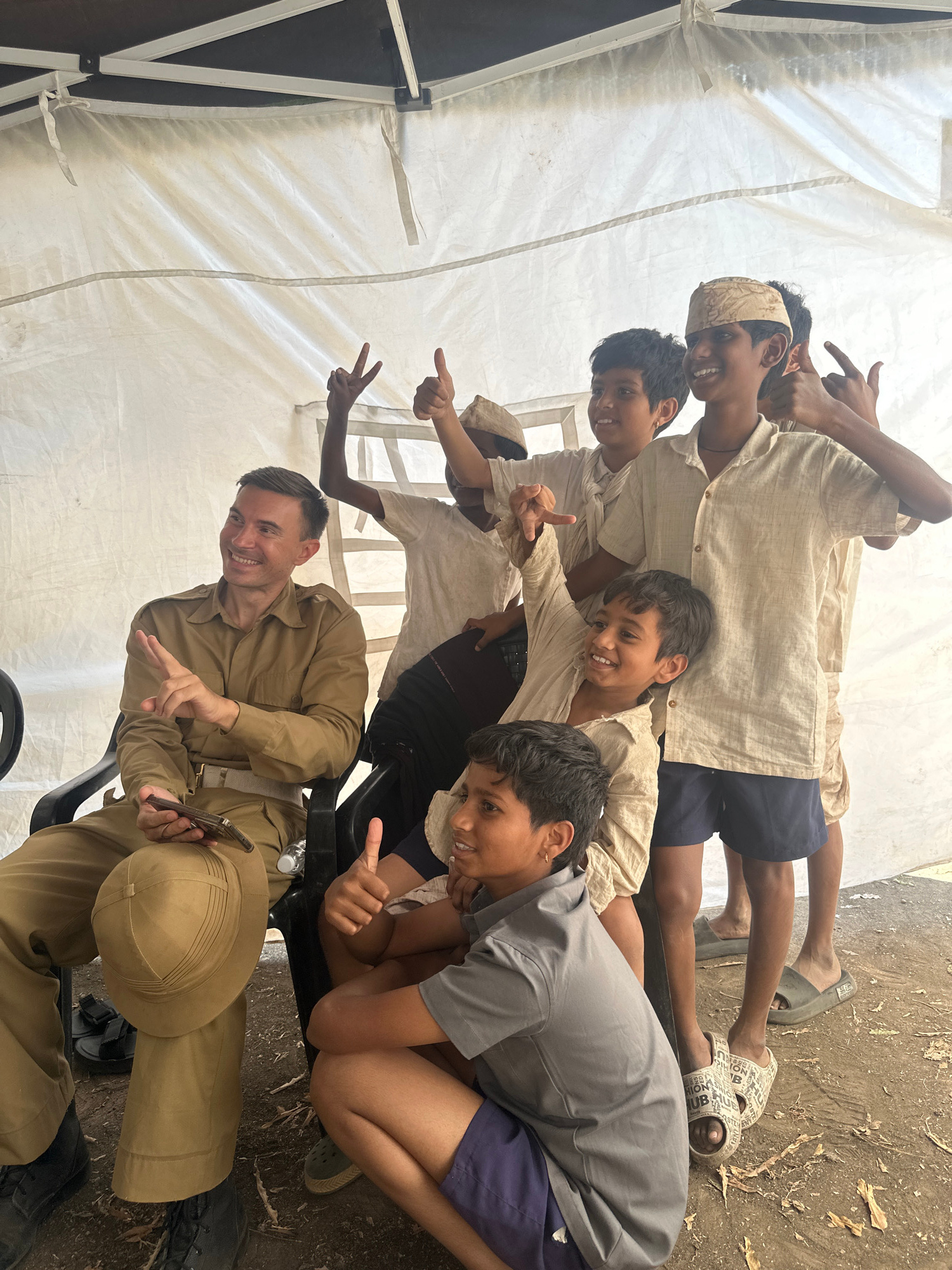 The image shows a group of five boys and a man in what appears to be a tent. The man is seated and wearing a khaki uniform with a matching hat resting on his lap. He is holding a cell phone in his lef…read more