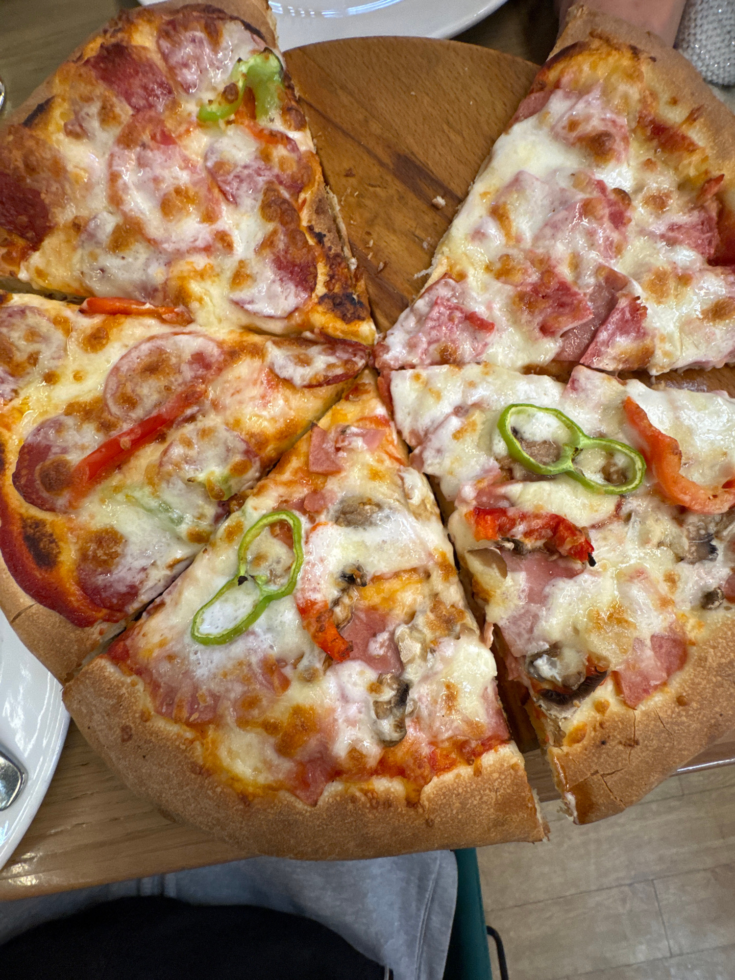 The image shows a partially eaten pizza served on a wooden platter. The pizza is cut into slices and appears to be topped with cheese, pepperoni, ham, tomatoes, mushrooms, and green pepper rings. The…read more