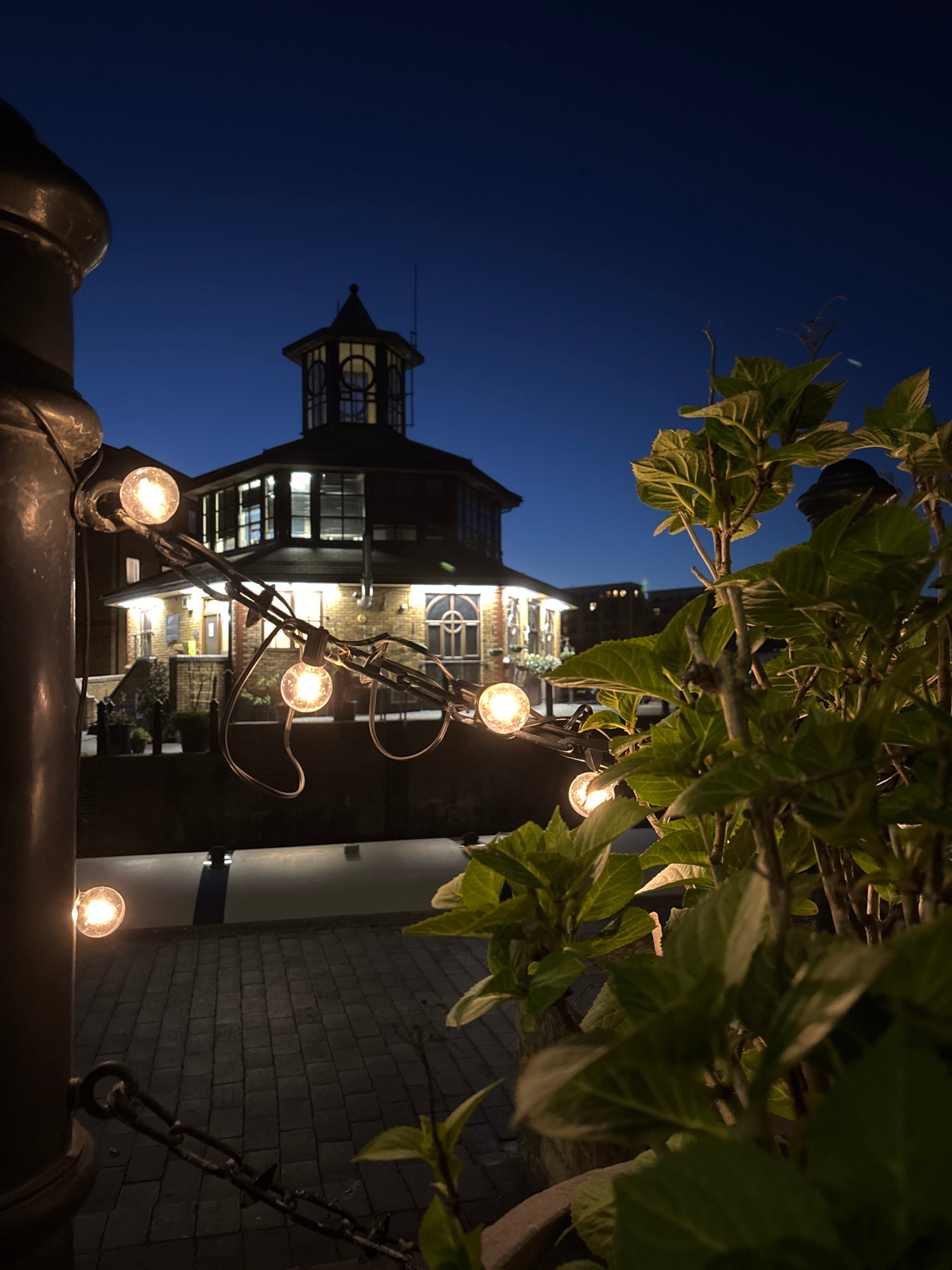 The photo, taken at night, features a building with a clock tower against a deep blue sky, partially obscured by a tree with leaves and a string of lights. The building is well-lit, with multiple wind…read more