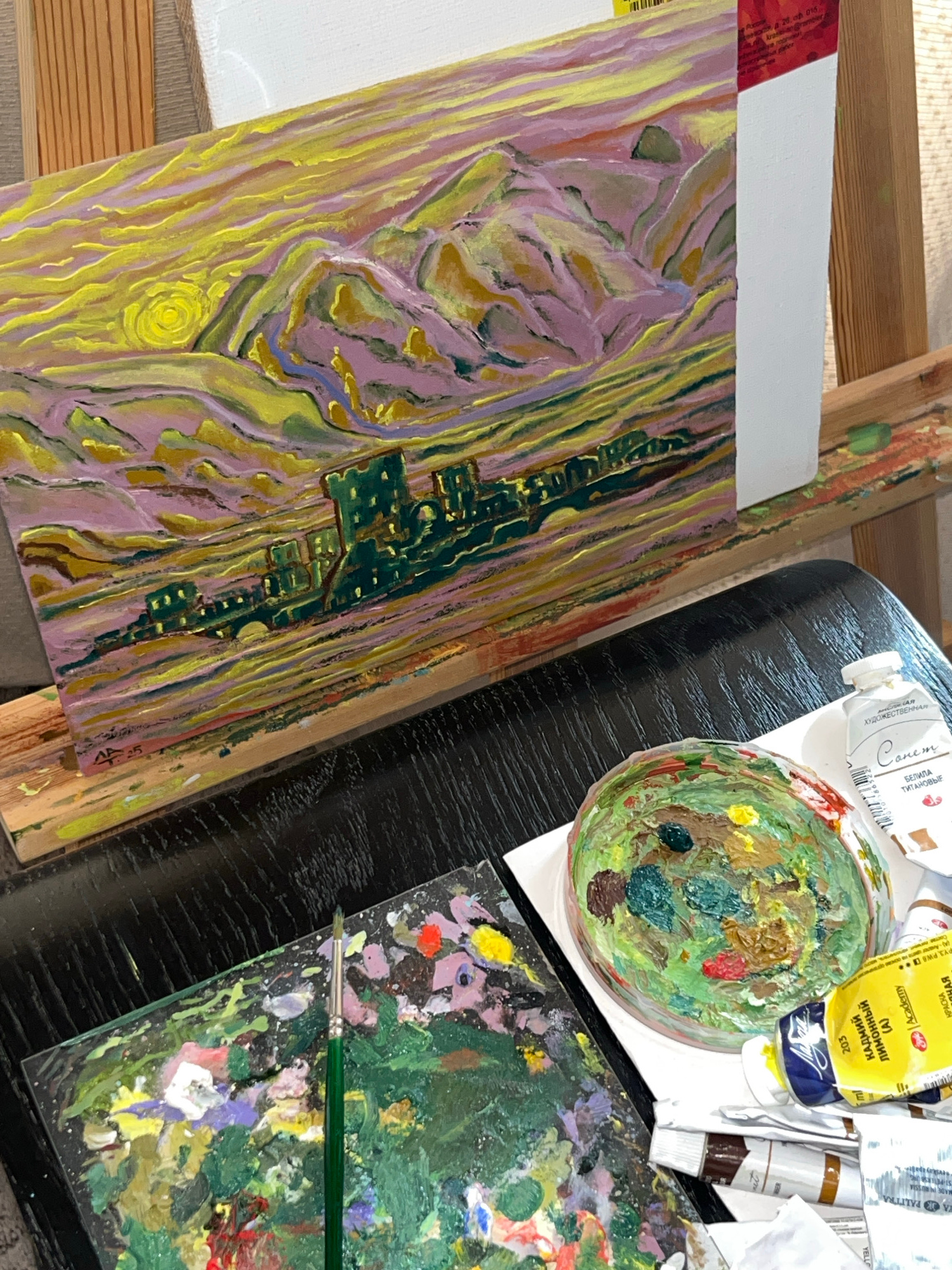 The image presents a tabletop still life in an art studio setting. It focuses on the artist's workspace and materials. Subjects and Objects: * A canvas with an unfinished landscape painting in prog…read more