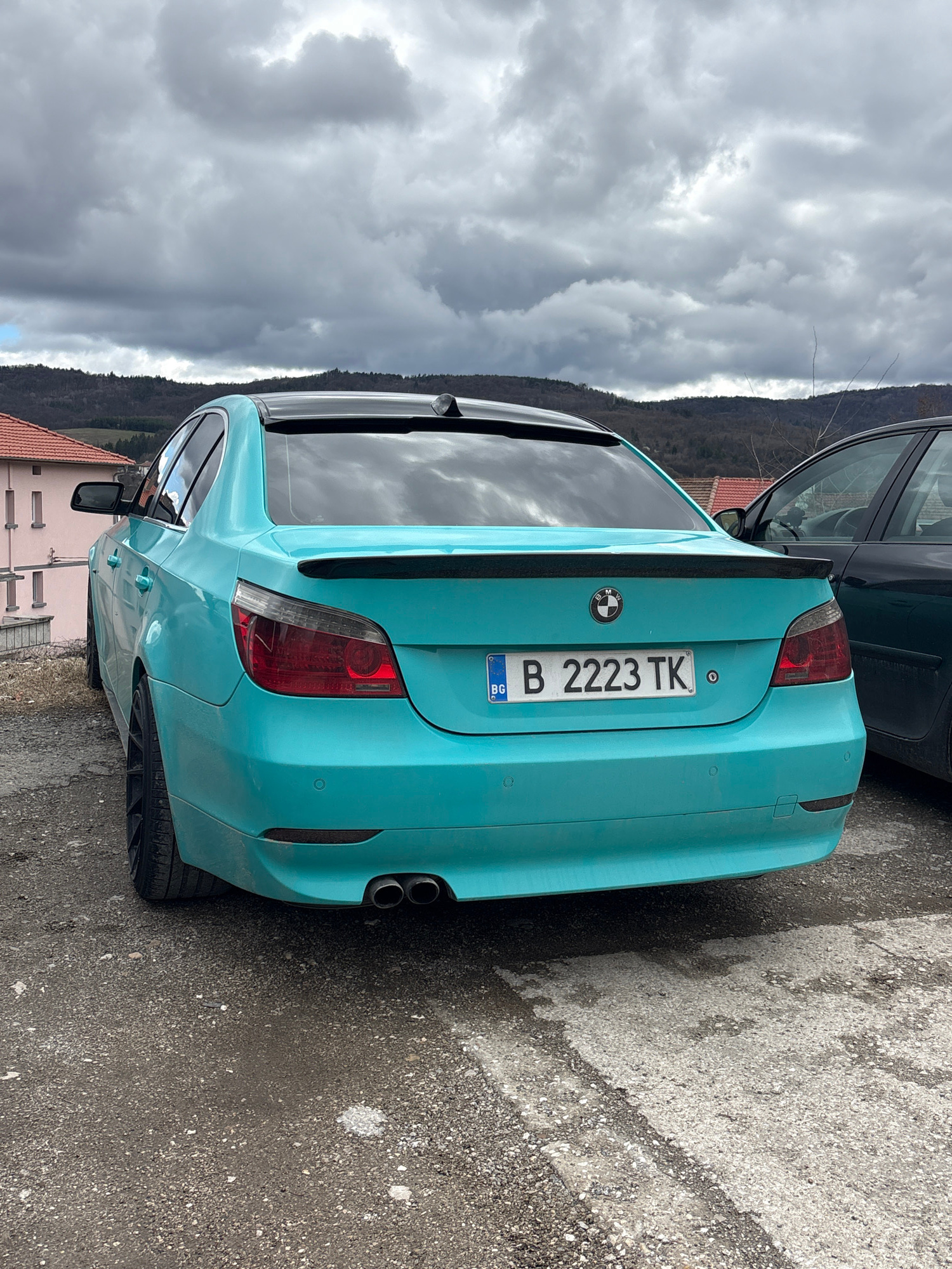 The image shows the rear of a turquoise BMW with Bulgarian license plate B 2223 TK. It is parked outdoors in an urban environment. The surroundings include buildings with light-colored facades and red…read more