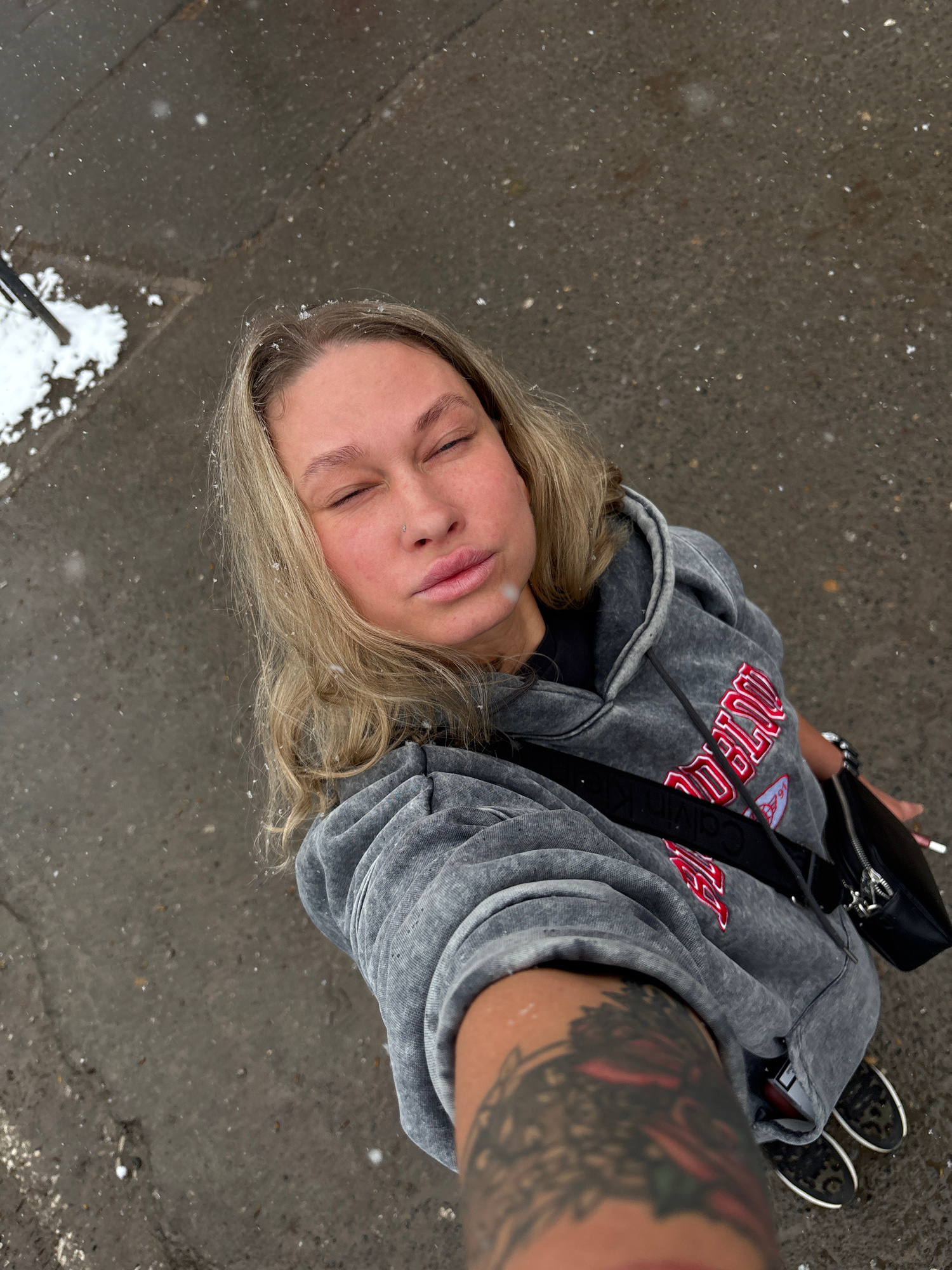 A first-person perspective photograph, taken outdoors during snowfall, shows a woman in a gray hoodie with red lettering, black bag, and black shoes. The location appears to be a city street with a co…read more