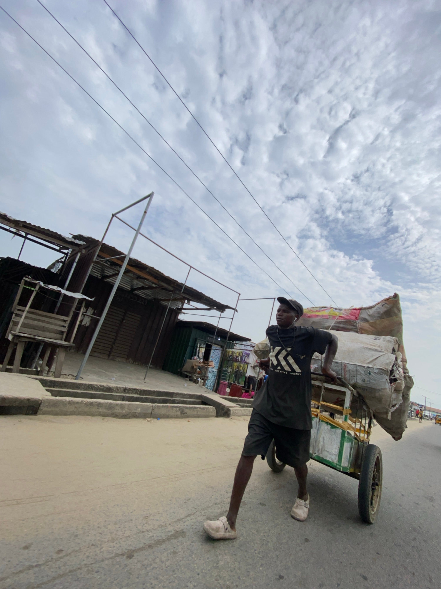 A man in a black shirt, black shorts, a black cap, and white shoes is pulling a green and yellow cart loaded with burlap sacks on a concrete road. To the left of the road are buildings with corrugated metal roofs. The sky is cloudy. The location is identified as Ado, Nigeria, based on contextual information. | Open Wire
