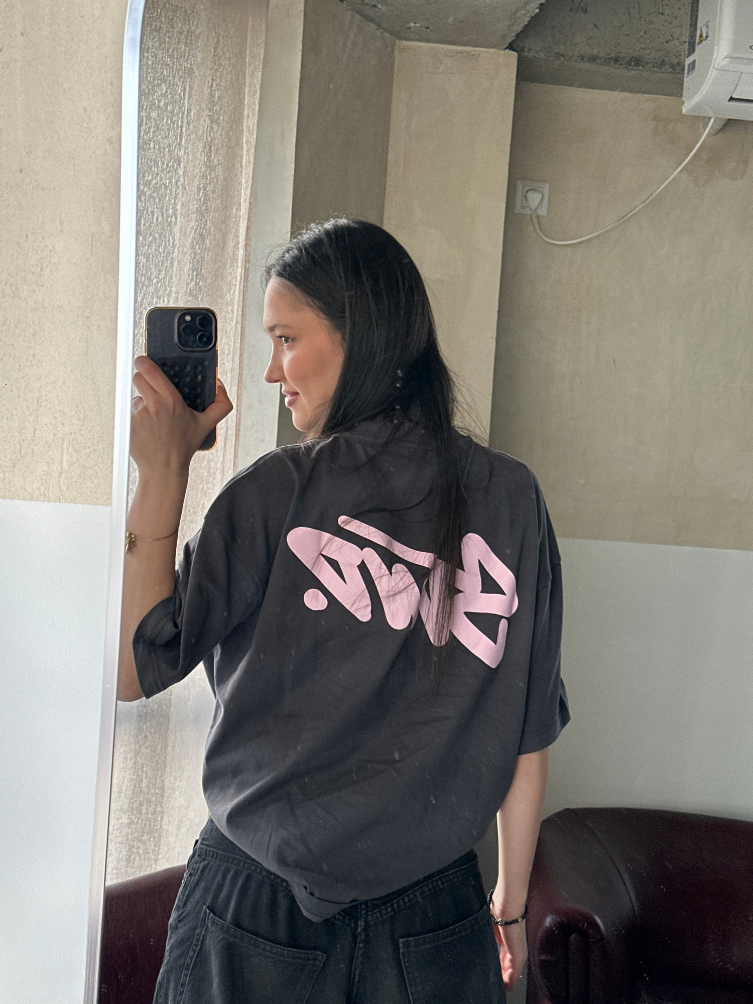 A woman is taking a selfie in a mirror. She has long dark hair and is wearing a dark t-shirt with a pink design and dark pants. She is holding a black smartphone with a camera. The background is a wal…read more