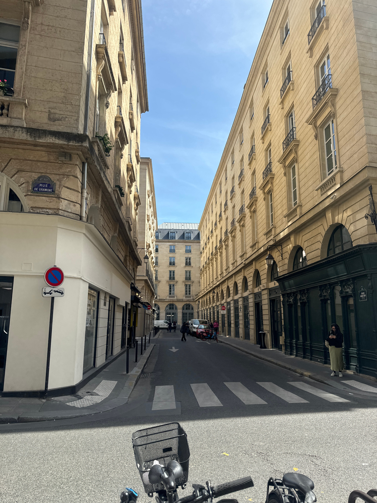 This photograph captures a street scene in Paris, France, looking down a narrow street lined with classical Haussmannian buildings. The perspective is from the sidewalk, with part of a bicycle's handl…read more