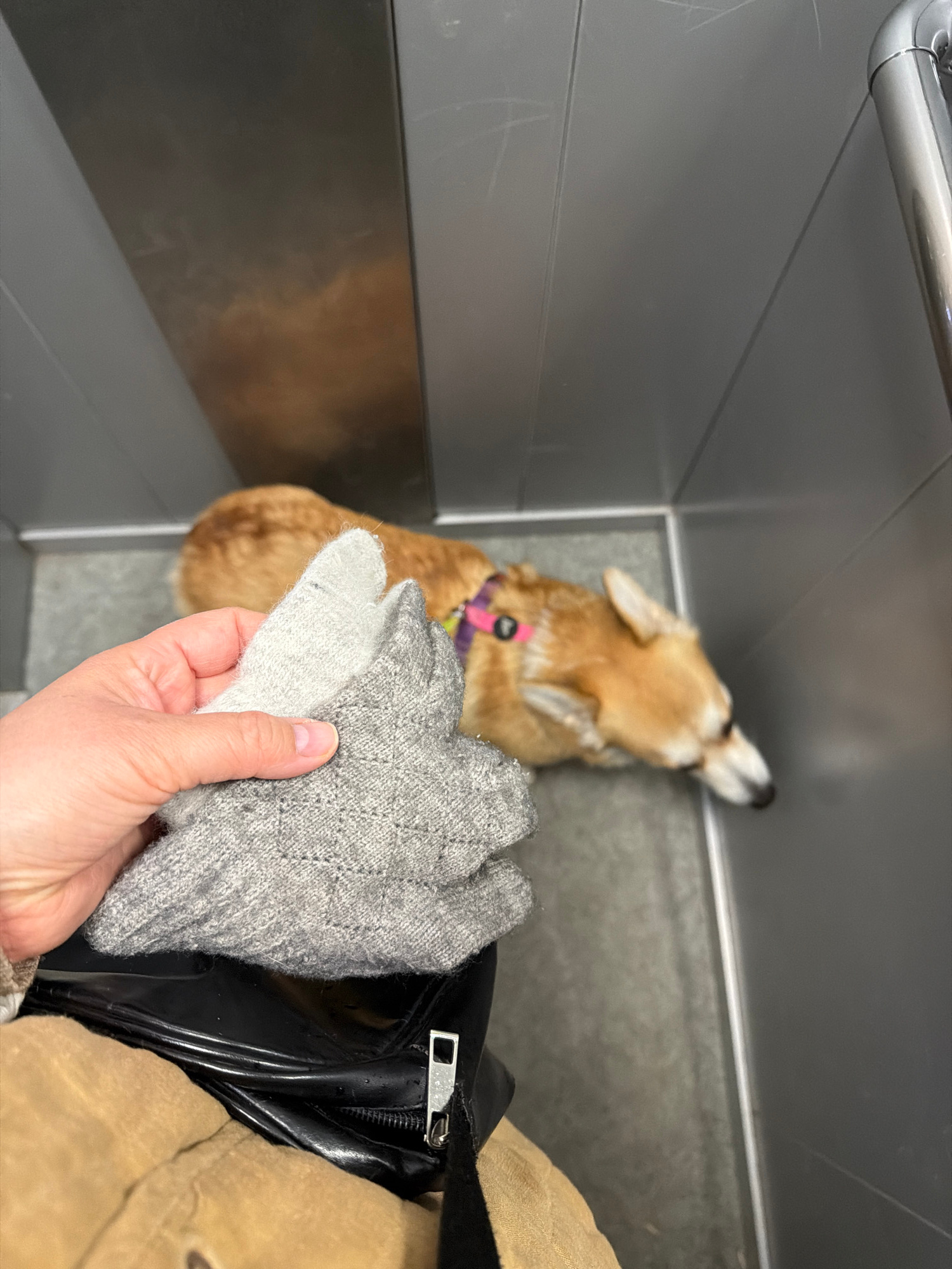 The image shows a person holding a pair of gray gloves in what appears to be an elevator. In the background, a blurred dog with a pink collar is visible. There is a black bag and a tan jacket or coat…read more