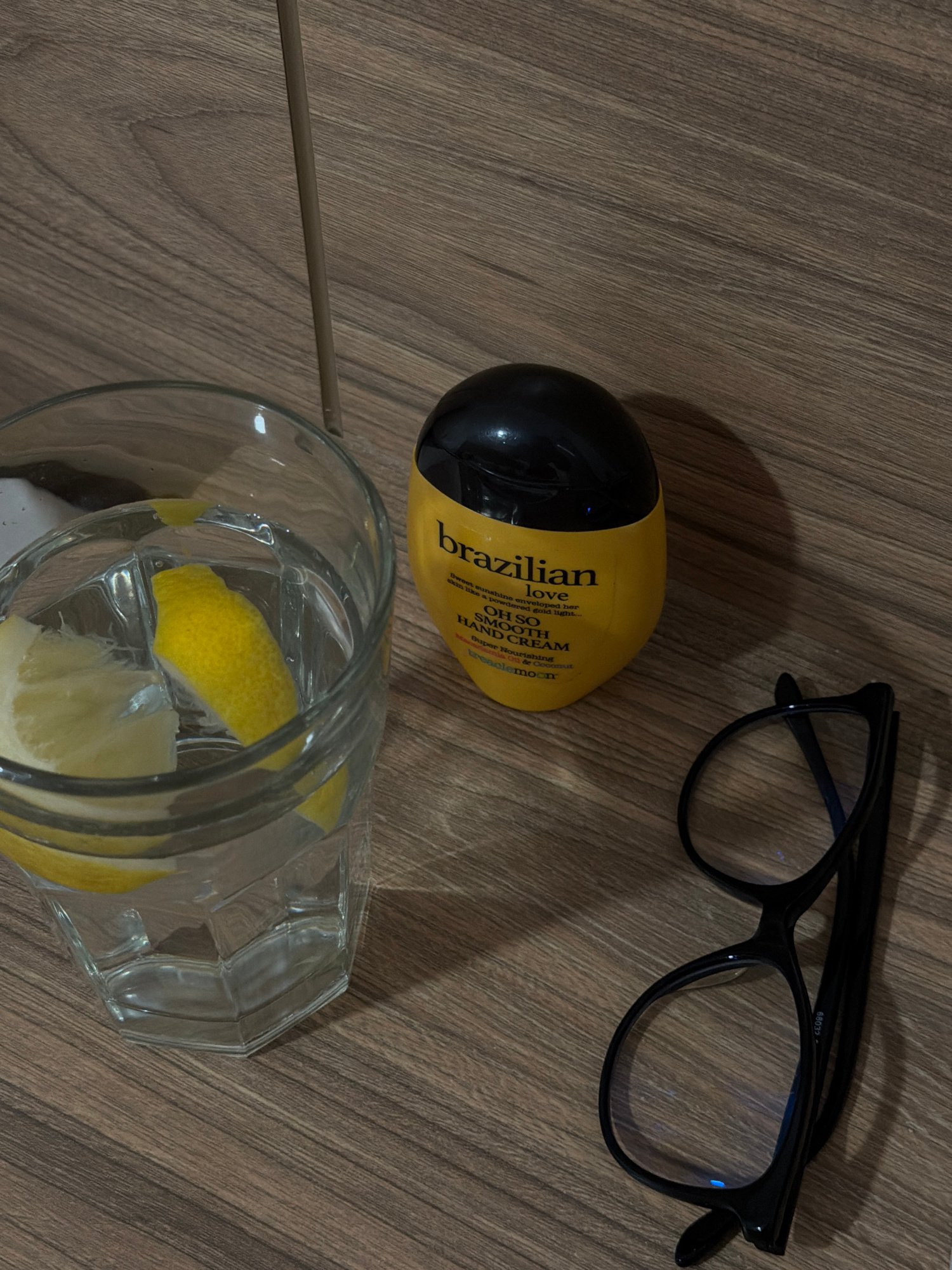 The image depicts a flat, wood-grain surface with several items placed upon it. A clear glass containing water and lemon slices is positioned towards the bottom center. Adjacent to the glass, a thin w…read more