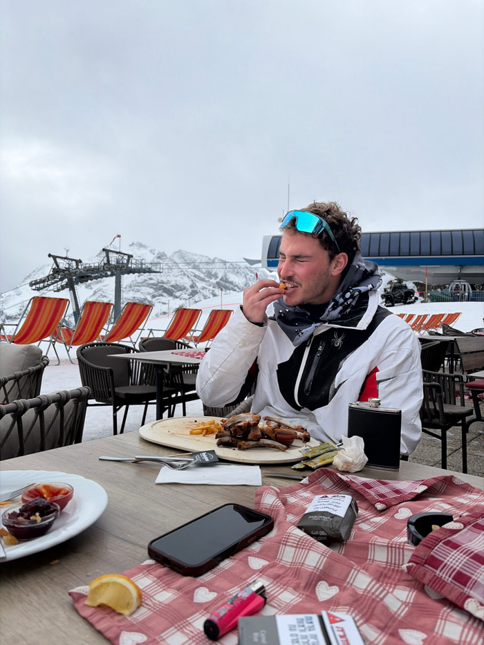 An outdoor, eye-level photograph captures a man eating a meal at a wooden table in a snowy mountain environment, identified as a ski resort in Finkenberg, Austria. The man, appearing to be in his late…read more
