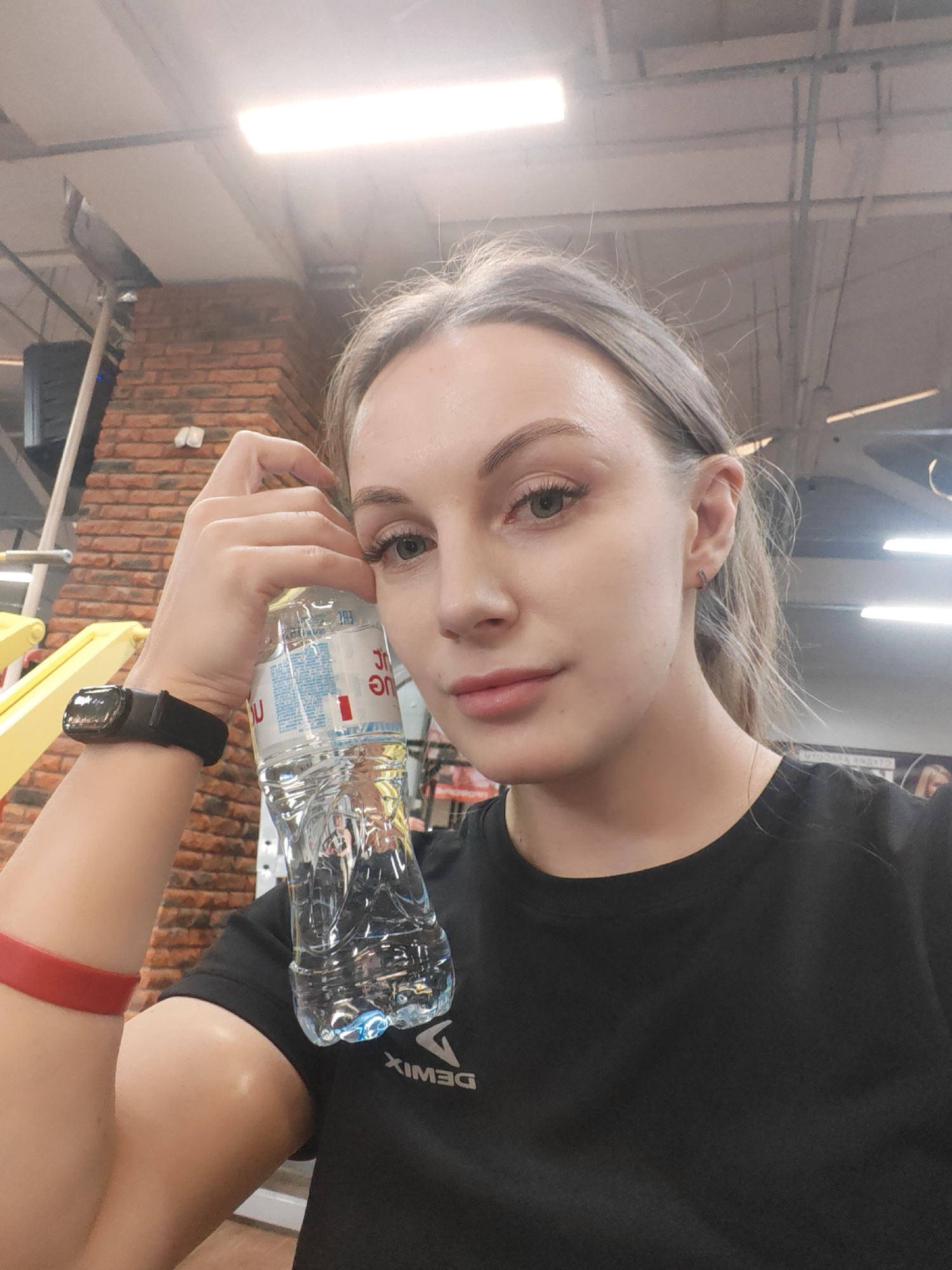 A young woman is holding a water bottle, possibly at a gym. The water bottle is labeled "DEMIX". The woman has a fitness band on her right arm, and a watch on her left wrist. A brick wall is visible i…read more