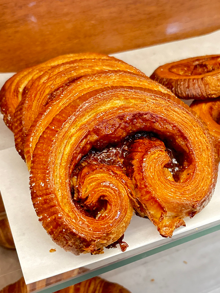 A close-up, high-angle photograph presents a single, large, golden-brown laminated pastry, consistent with a caramelized Kouign-amann, displayed within a bakery or cafe in Tel-Aviv, Israel. The pastry…read more