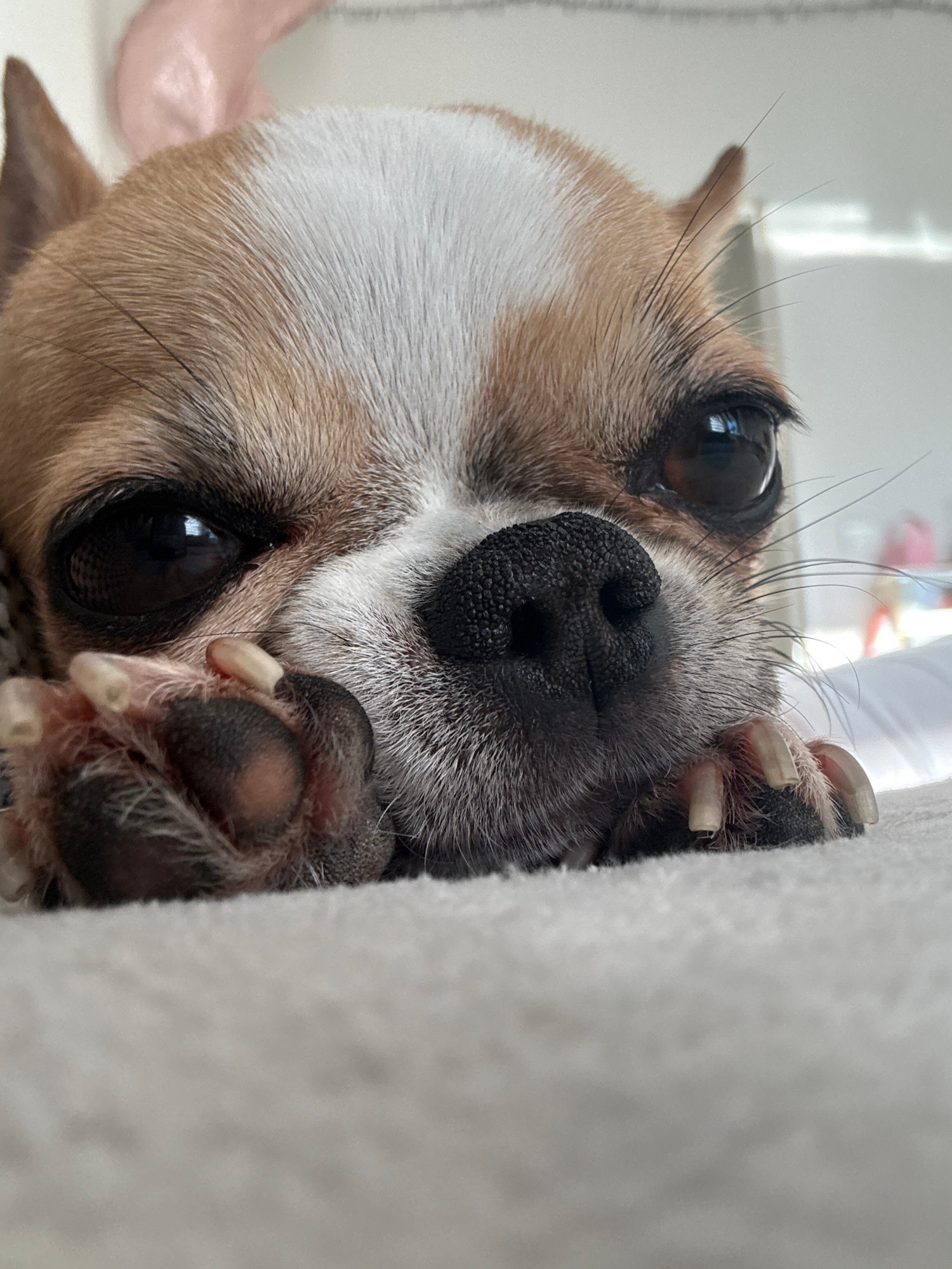 A close-up, high-angle photograph shows a tan and white Chihuahua dog. The dog is positioned with its head and front paws visible near a white, soft, textured fabric. The dog's paws are dark in colorβ¦read more