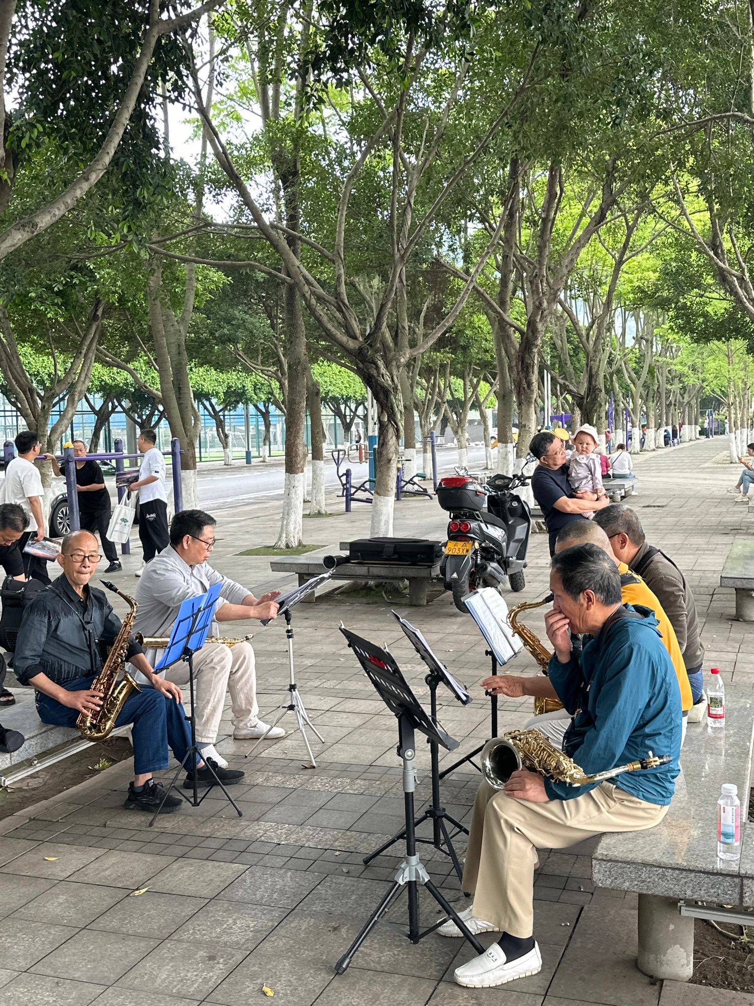 The image depicts a group of people playing saxophones in an outdoor setting, possibly a park or public space. The location is likely Jiangjin, China. Several individuals are positioned along a paved…read more