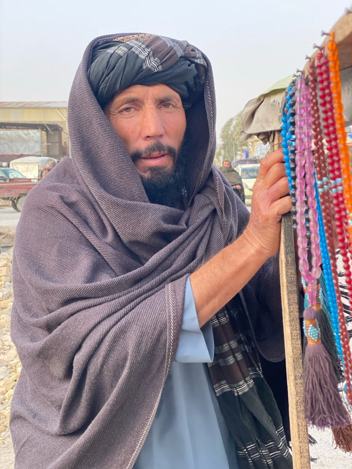 The image depicts a street scene in Kandahar, Afghanistan, centered on a middle-aged to elderly man standing outdoors. The man, with weathered skin, dark eyes, and a short dark beard, wears a dark gre…read more