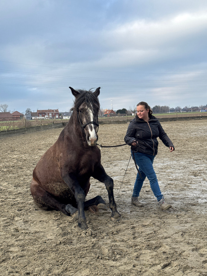An outdoor scene in Estaimpuis, Belgium, depicts one adult female and one horse in an equestrian arena under an overcast sky. The woman, positioned right of center, faces left while walking forward, h…read more