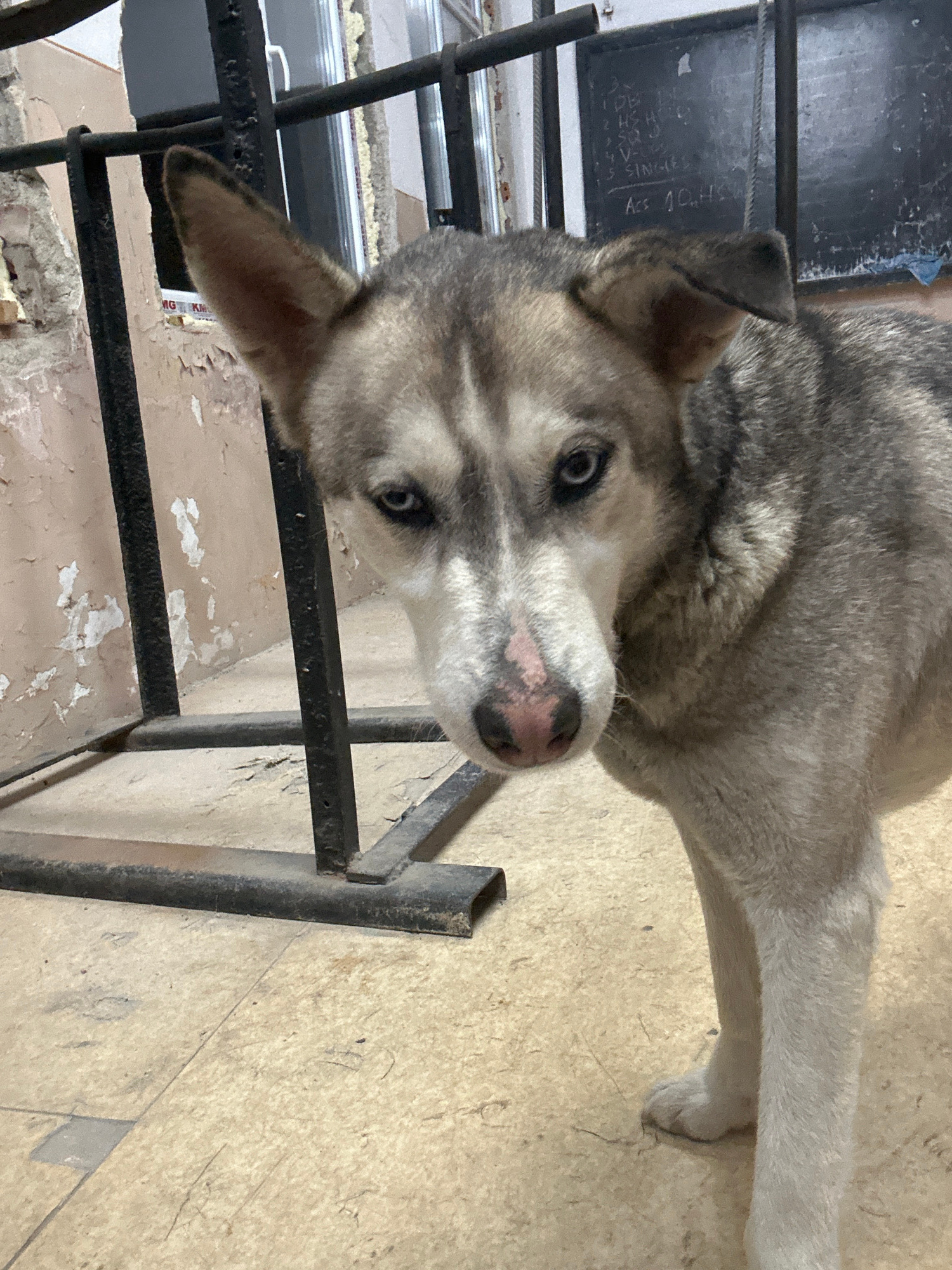 A medium-sized, grey and white husky dog is laying down. The dog's head is near a black metal object. The floor is beige. A wall with peeling paint is visible. A blackboard is visible in the backgroun…read more