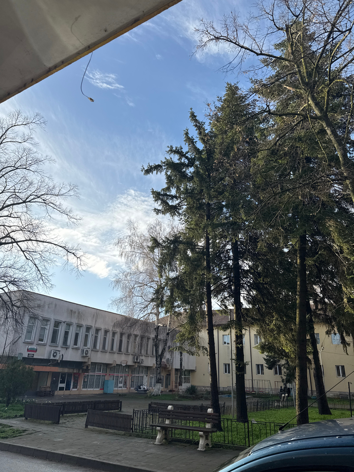 The image depicts an outdoor scene in Dulovo, Bulgaria, featuring a combination of natural and urban elements. The frame is oriented upwards, capturing buildings, trees, and a section of the sky. A li…read more