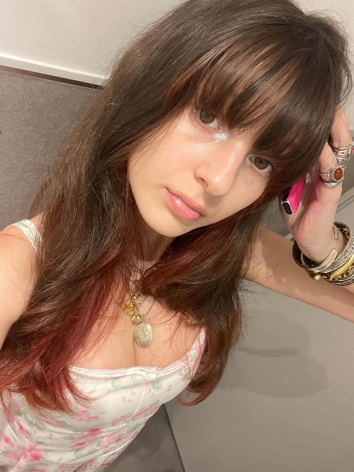 A woman with brown hair and bangs is posing for a selfie. She is wearing a white floral dress and jewelry, including rings, bracelets, and a necklace with a coin pendant. The background appears to be…read more
