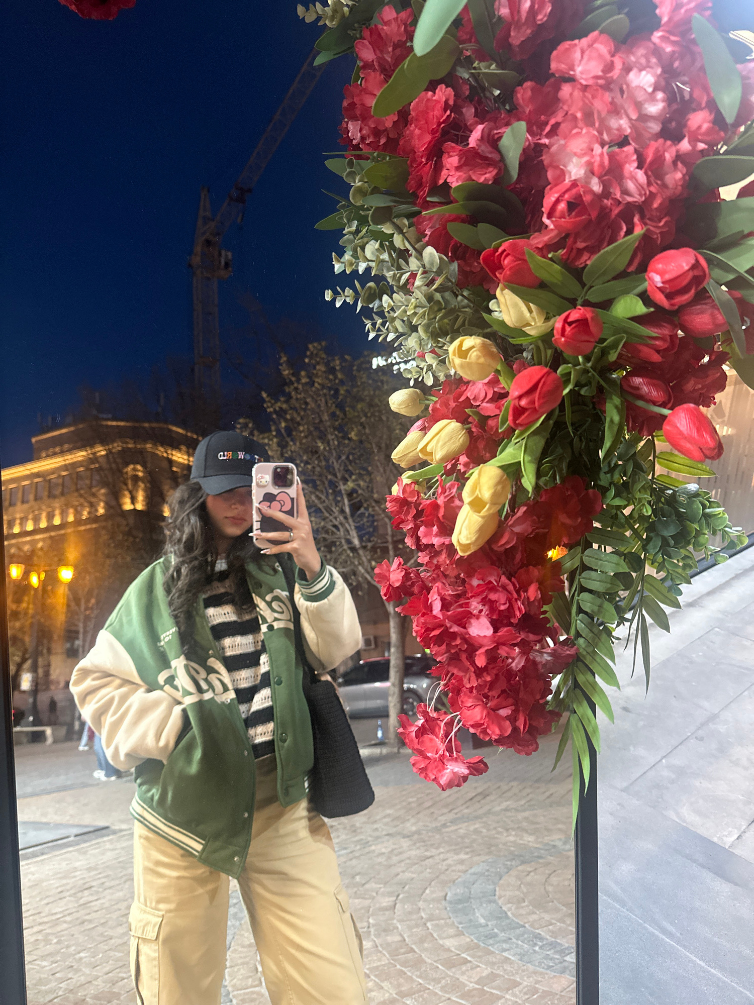 A young woman is taking a selfie in a mirror display decorated with red and yellow flowers. She is wearing a baseball cap, a green and white varsity jacket, and khaki pants. The mirror reflects a stre…read more