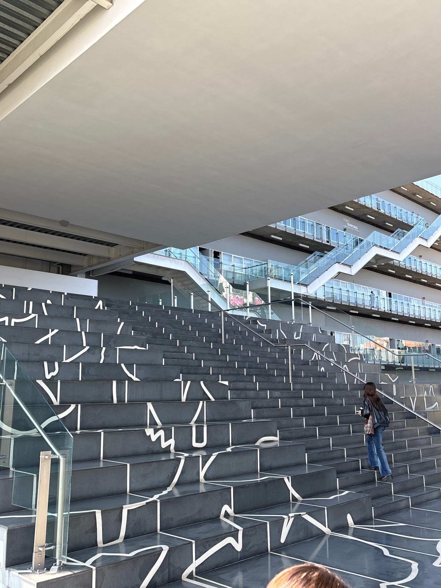 The image shows an overhead shot of the stairs at the Biblioteca Vasconcelos in Mexico City, Mexico. The stairs are decorated with white lines on black steps, creating a graphic pattern. Two people ar…read more