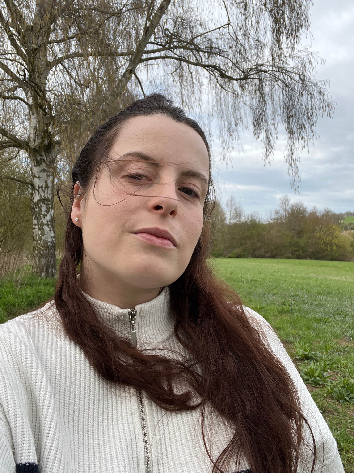 A woman with long brown hair and fair skin is posing for a selfie outdoors. She is wearing a white zip-up sweater. Behind her, there is a field of green grass and trees. The sky is overcast. While Rot…read more