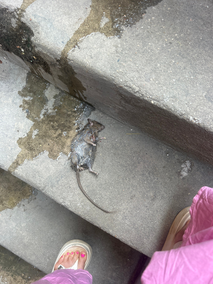 The scene shows a deceased rat lying on its back on a wet, grey concrete surface, which appears to be a step or part of a tiered structure. The rat's fur is dark and matted, consistent with being satu…read more