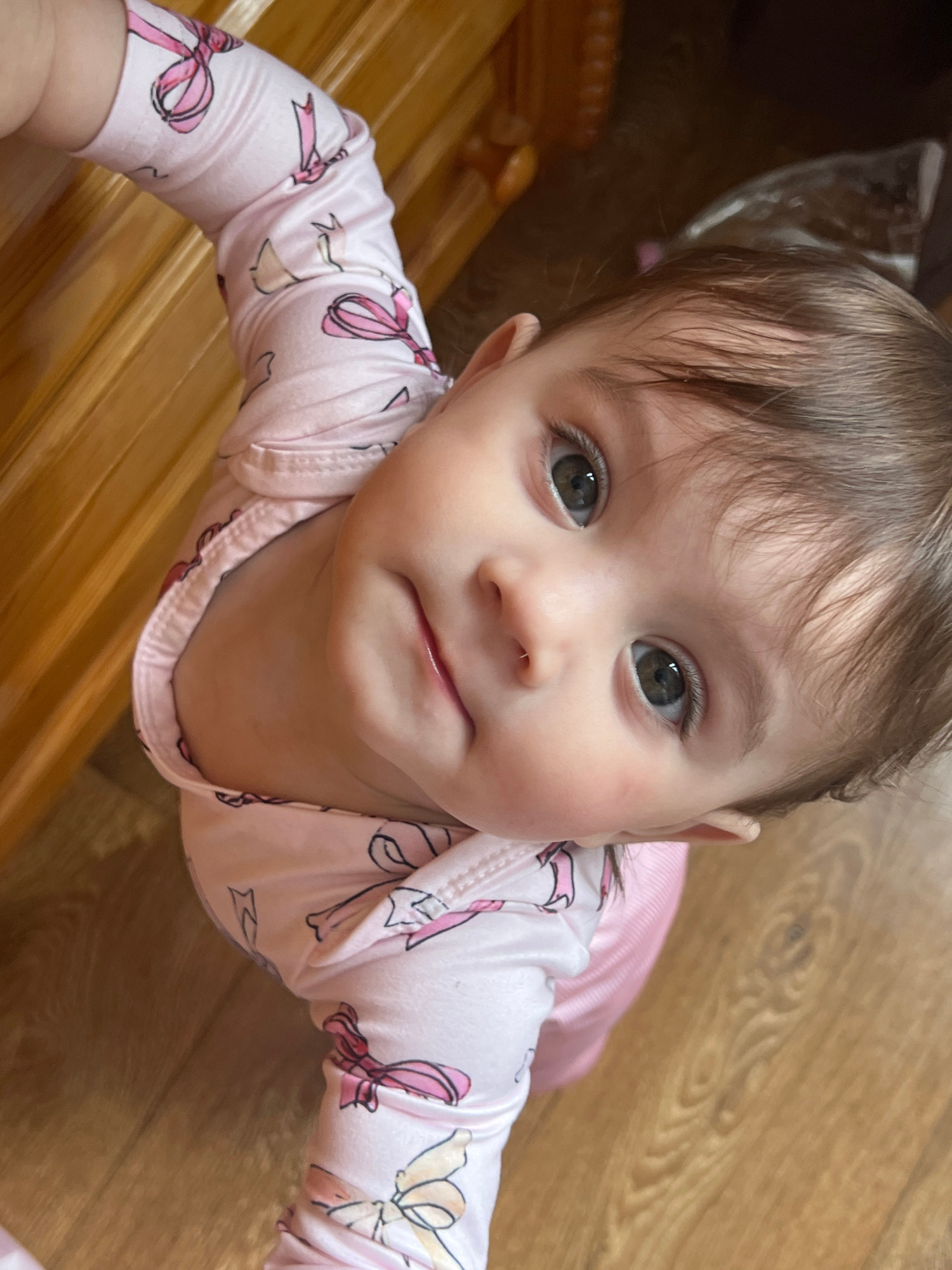 A baby with light skin, brown hair, and green eyes looks directly at the camera. The baby wears a pink long-sleeved garment with bow designs. The baby appears to be on a wooden floor, possibly in a re…read more