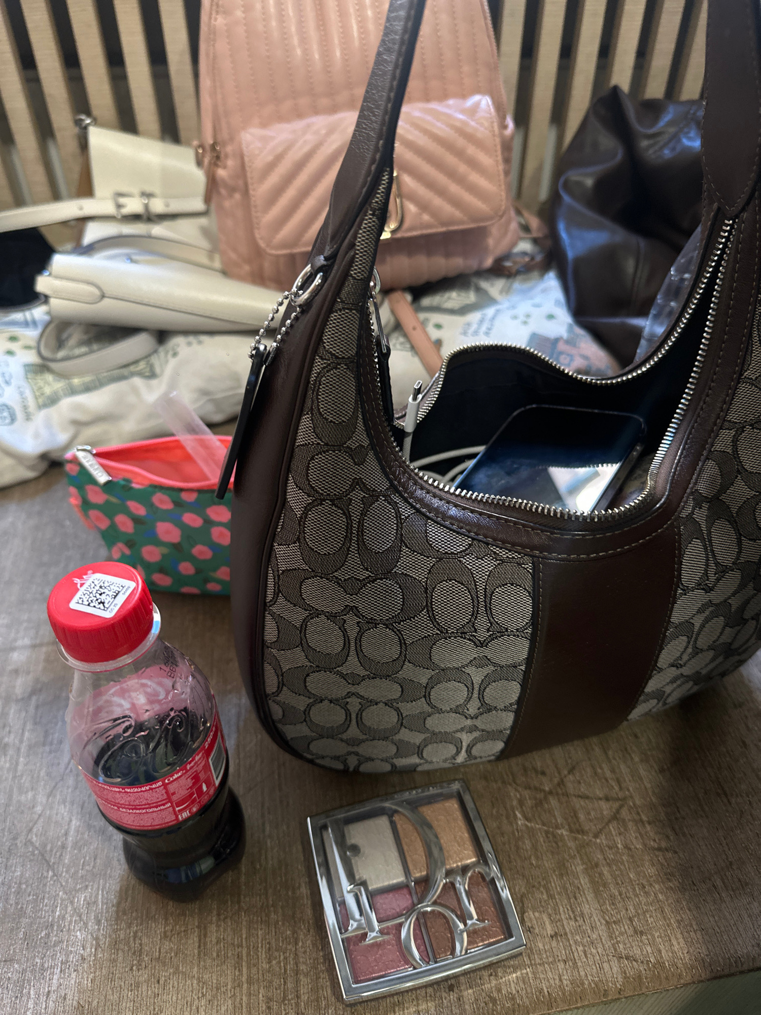 The image depicts a collection of personal items on a wooden surface. A partially open brown Coach handbag is prominently positioned. Inside the handbag, other items are visible, including a light pin…read more