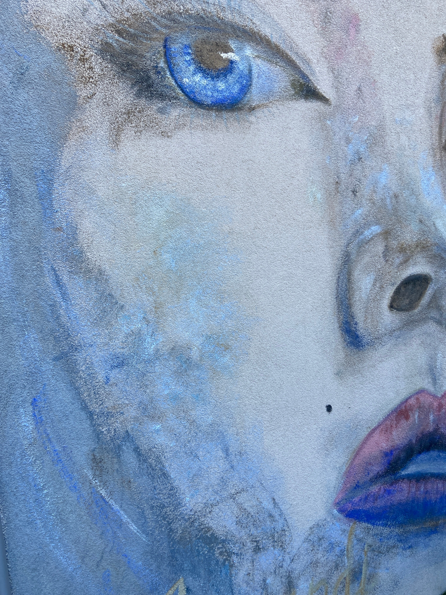The image is a close-up of a partially completed pastel drawing, focusing on the facial features of a person. The drawing is rendered in cool tones, primarily blues, grays, purples, and whites. The ey…read more