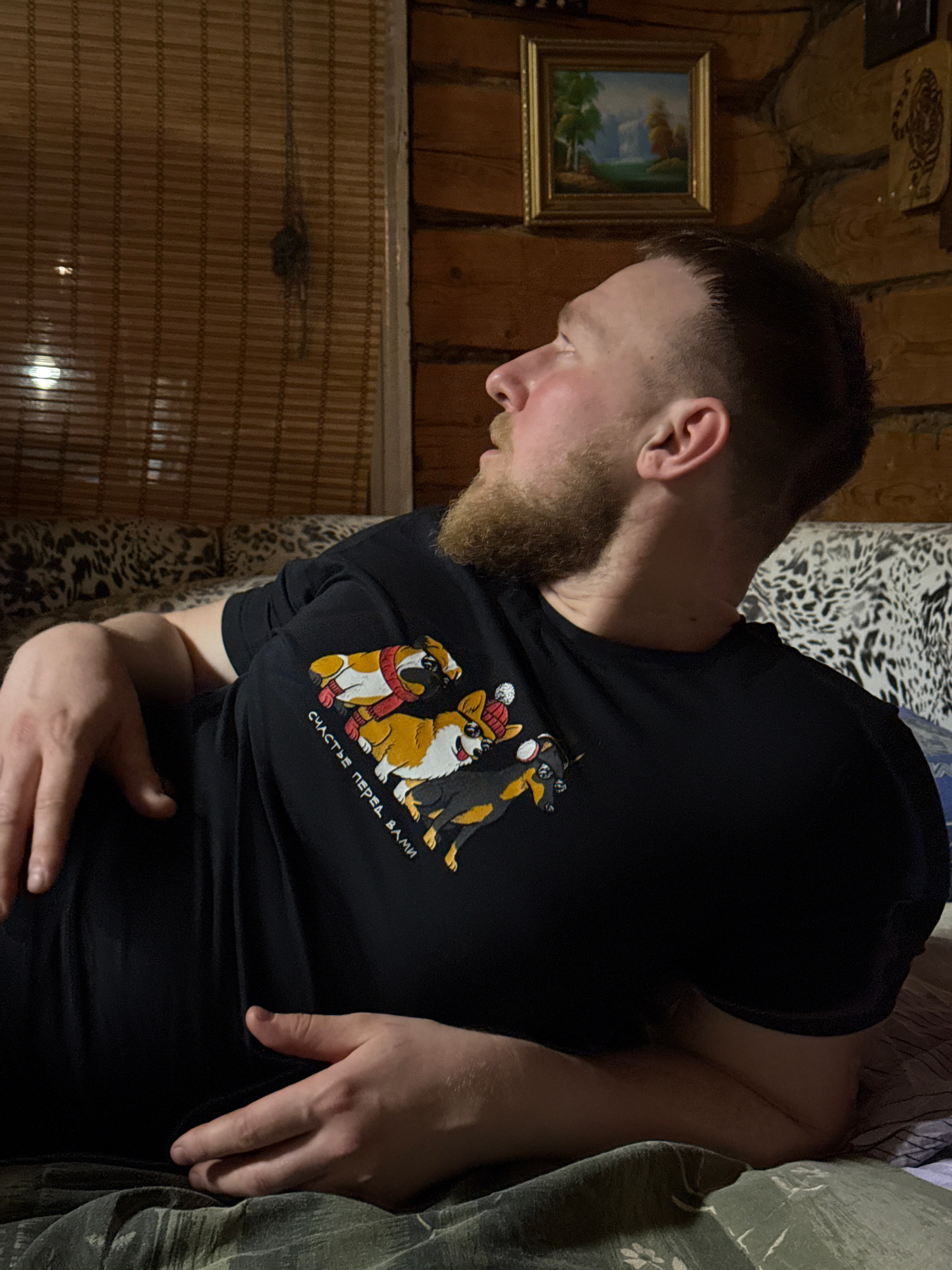 A man lies on a bed in a room with wood paneling on the walls. He is wearing a black t-shirt featuring a graphic of three dogs and Russian text. The room contains a small framed picture on the wall an…read more