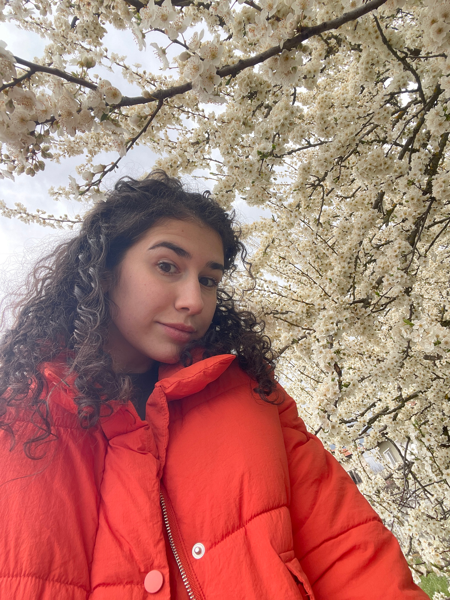 A selfie taken from a low angle shows a woman with curly hair and an orange puffer jacket. She is positioned under a tree heavily laden with small white flowers. The background is partially obscured b…read more