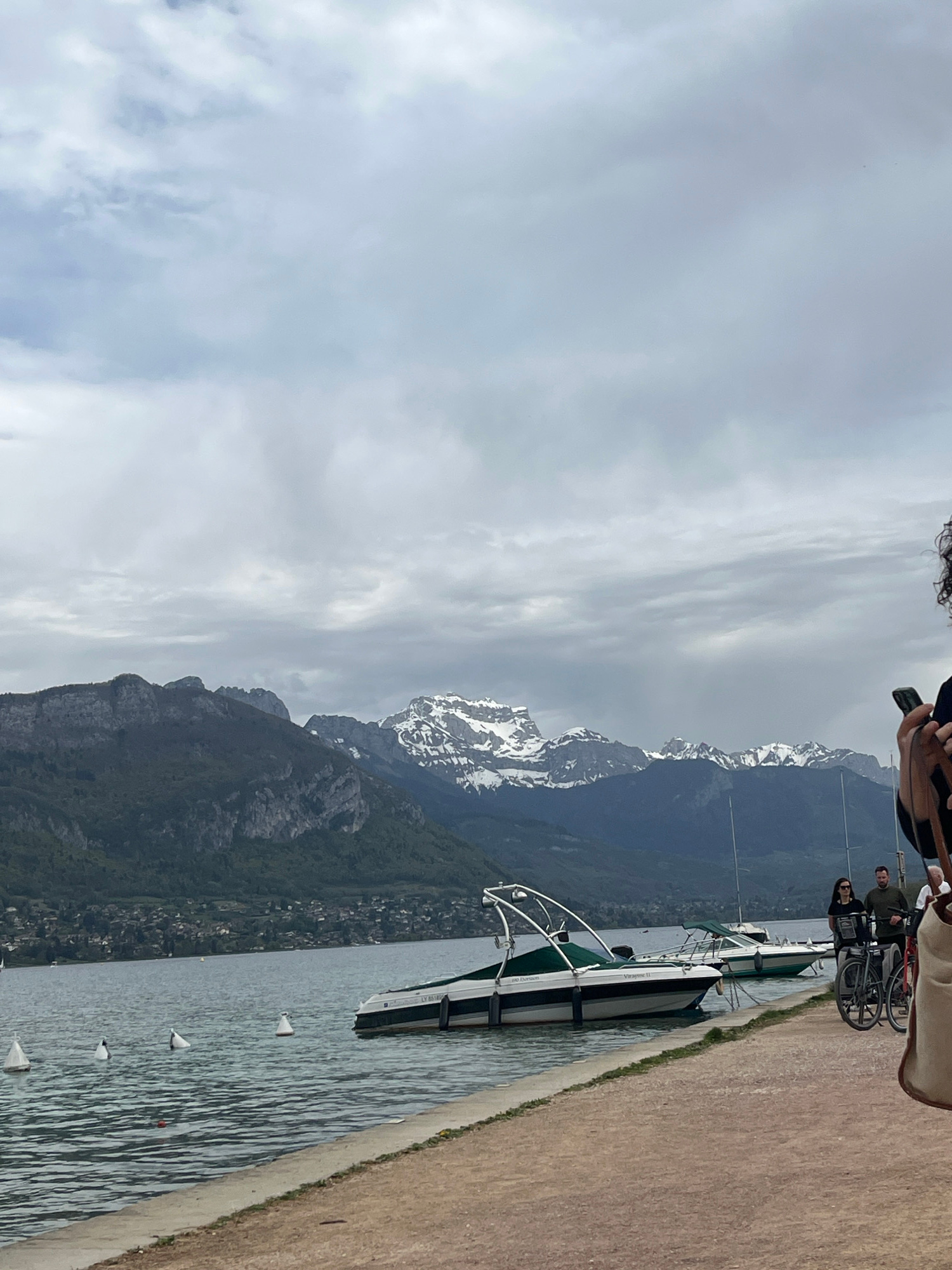 The image captures a scene on the shores of Lake Annecy, France. In the foreground, several small boats are docked along a paved promenade. A few people, including some on bicycles, are visible along…read more