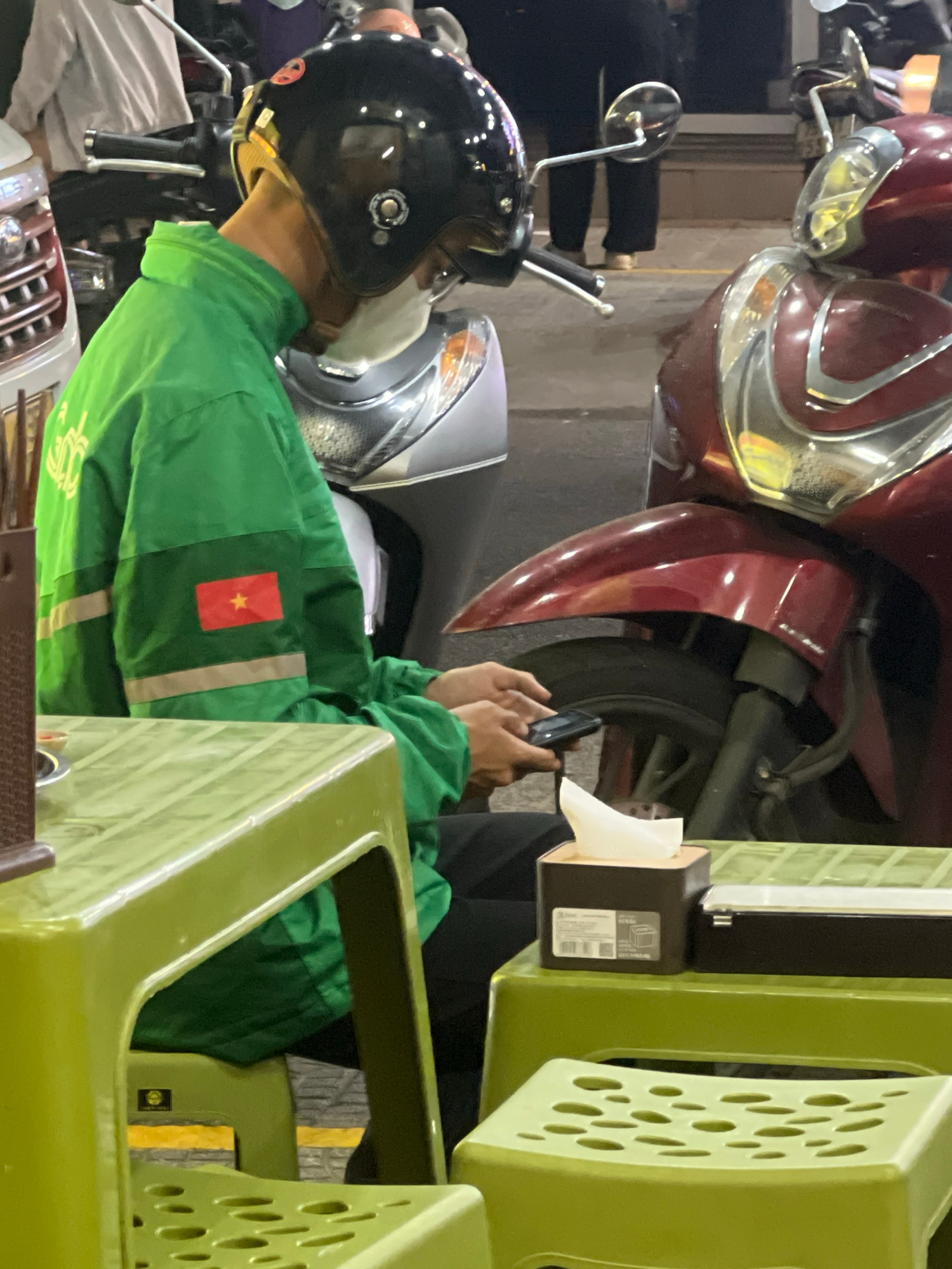 In Đà Nẵng, Vietnam, an individual wearing a green jacket with the Vietnamese flag patch and a motorcycle helmet uses a smartphone near a motorcycle, adjacent to green plastic crates and a tissue disp…read more