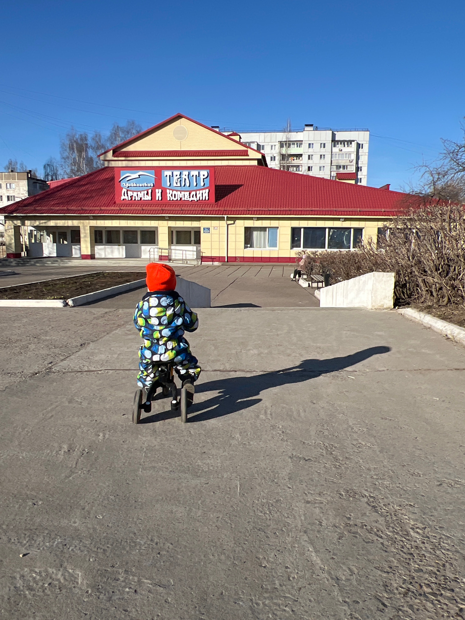 This media file captures an outdoor scene in Chaikovsky, Russia, on a bright, clear day. The primary subject is a young child, viewed from behind, wearing a brightly patterned jacket (blue, green, and…read more