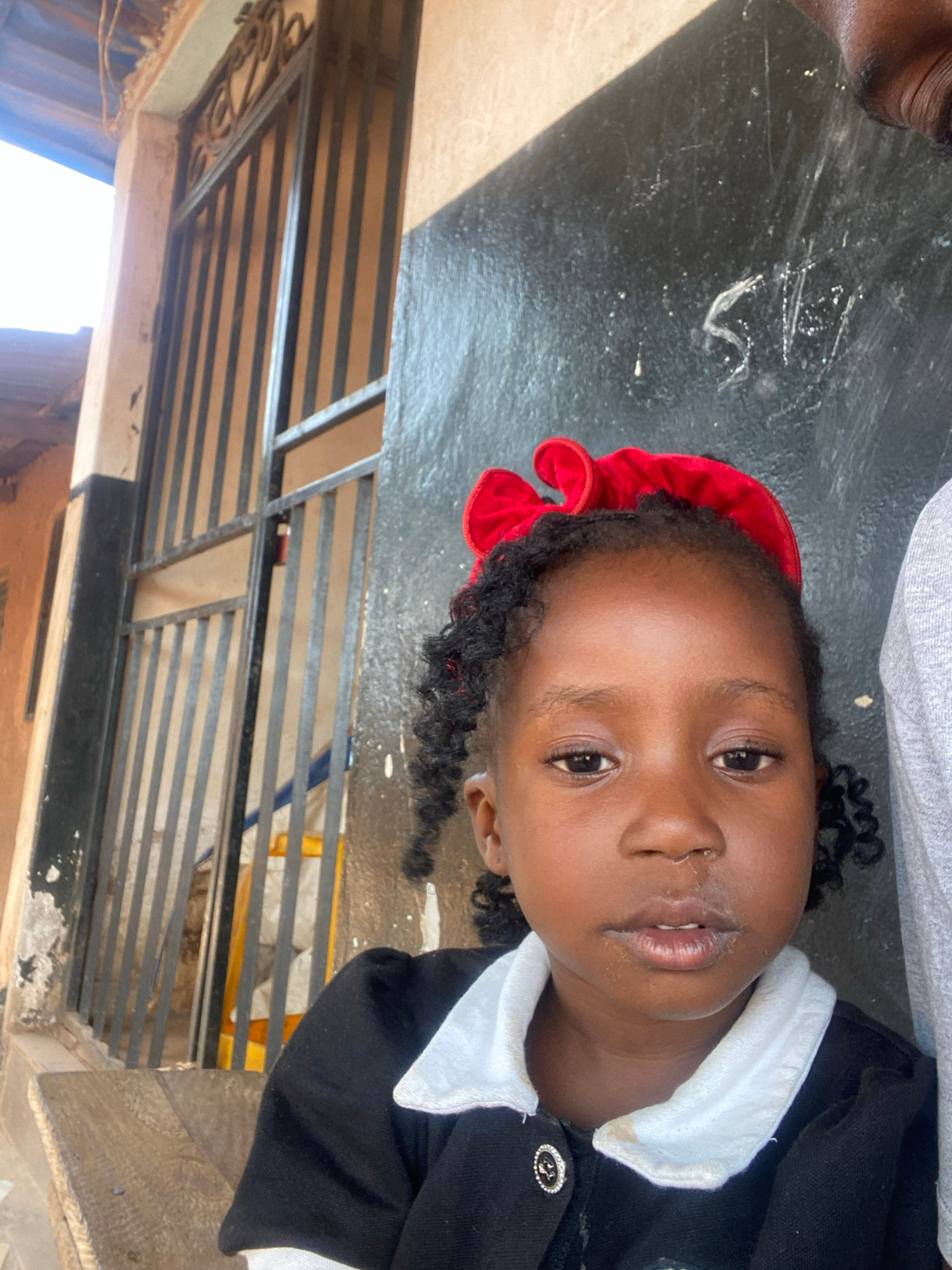 A young, dark-skinned child with curly black hair and a red bow is the central subject of the image. She is wearing a dark-colored jacket with a white collar. The environment appears to be outdoors, e…read more