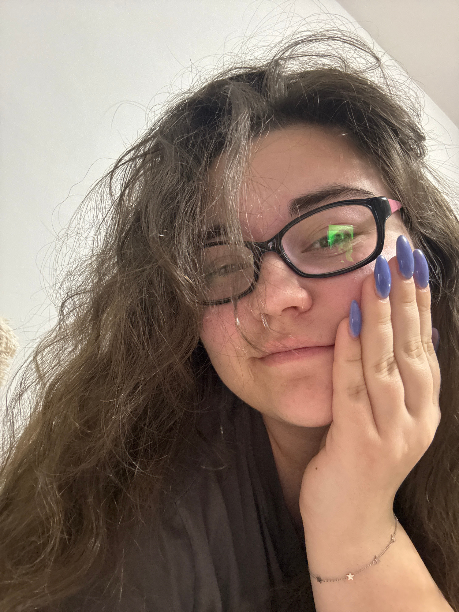 A woman with long brown hair, wearing black-framed glasses with a pink accent, is partially covering her face with her right hand, which has periwinkle-colored almond-shaped nails. She wears a bracele…read more