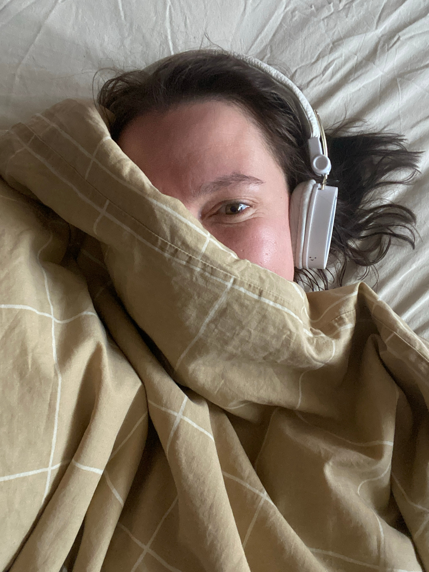 An individual is captured in a close-up, intimate shot, lying down indoors, likely in a bed. The person's face is partially obscured by a light brown or beige blanket featuring a subtle white grid pat…read more